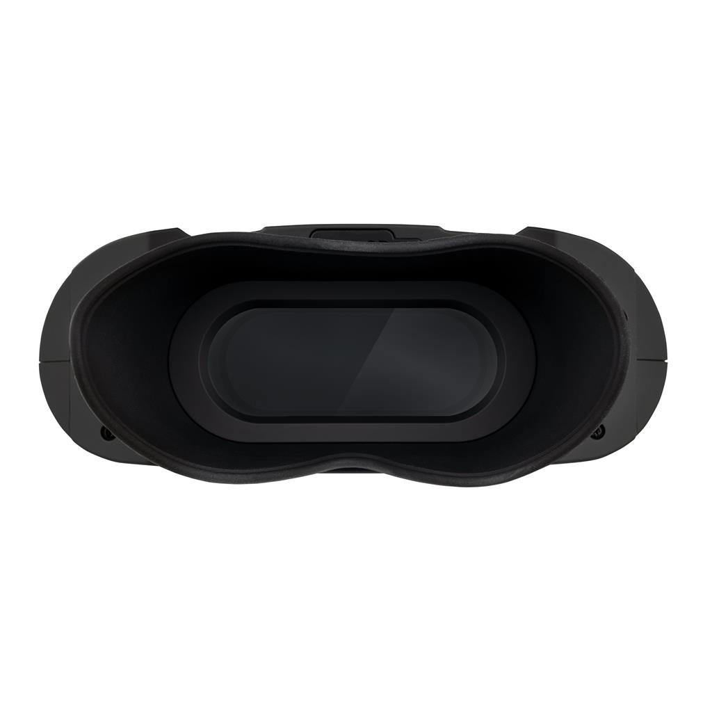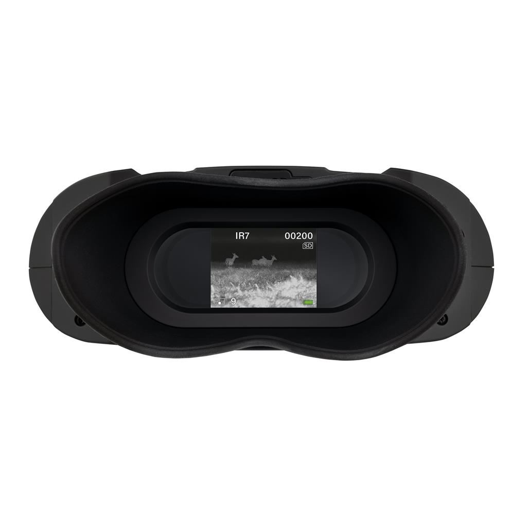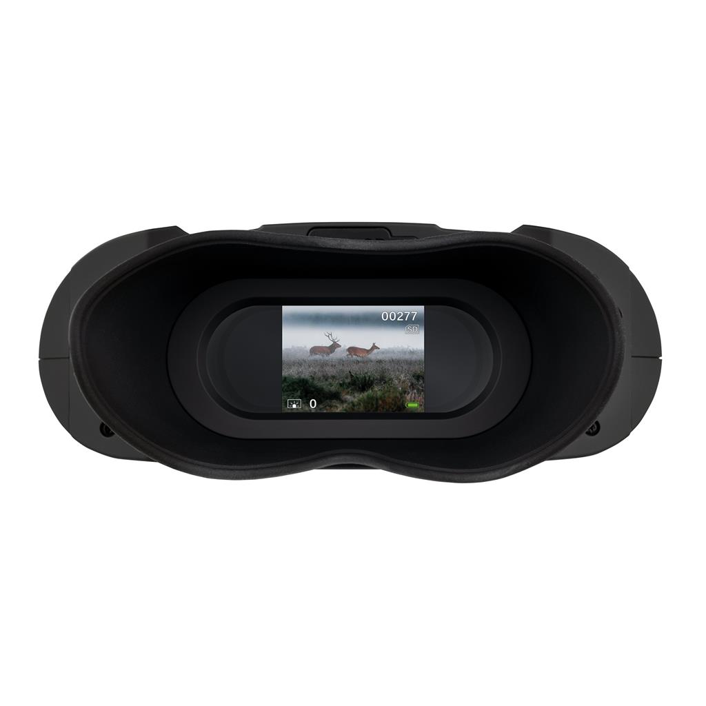 Das Display zeigt dir außerdem den Batteriestatus, die Anzahl der gespeicherten Aufnahmen und deine Helligkeits- und Infraroteinstellungen an. Die große, gummierte Augenmuschel sorgt dafür, dass kein unerwünschtes Licht auf das Display fällt.