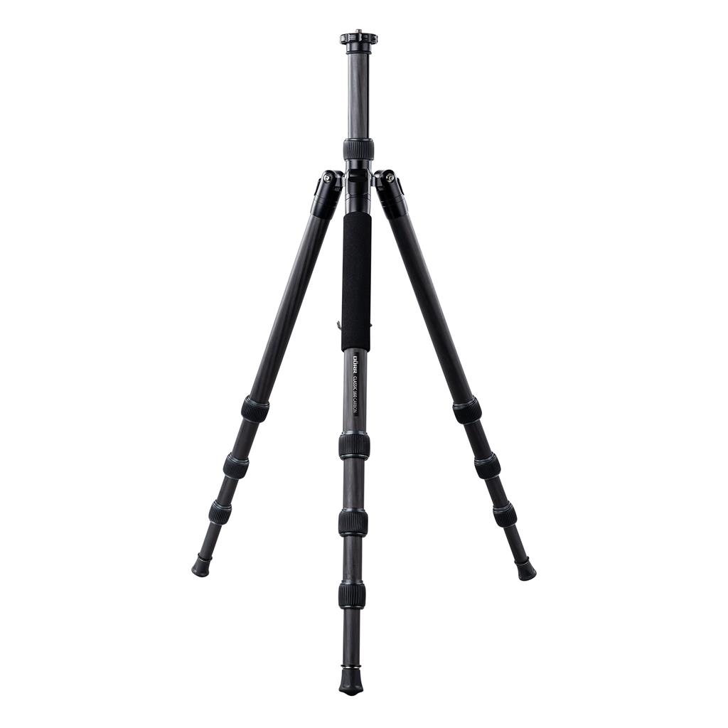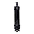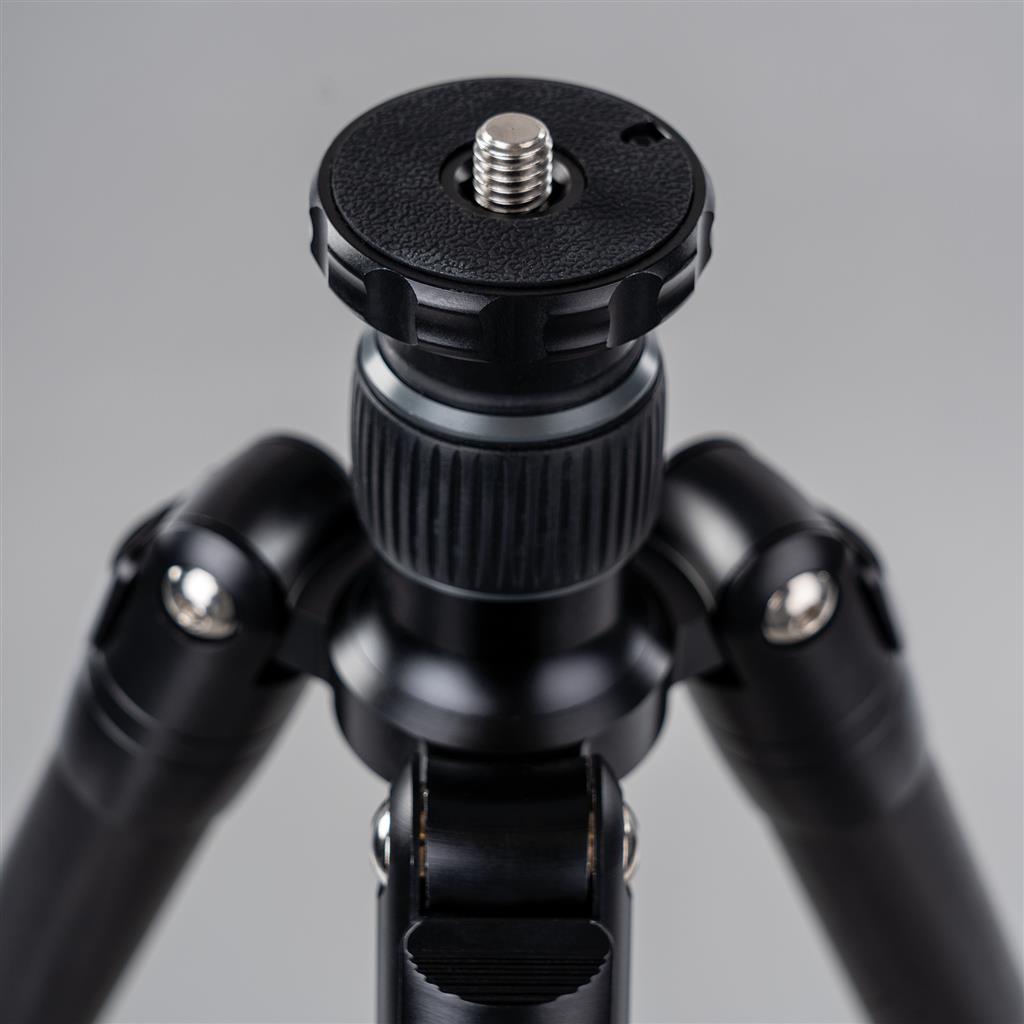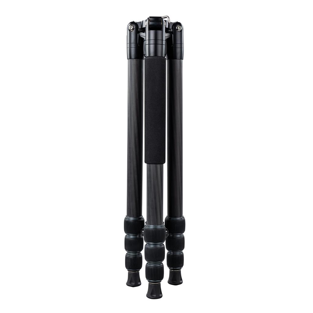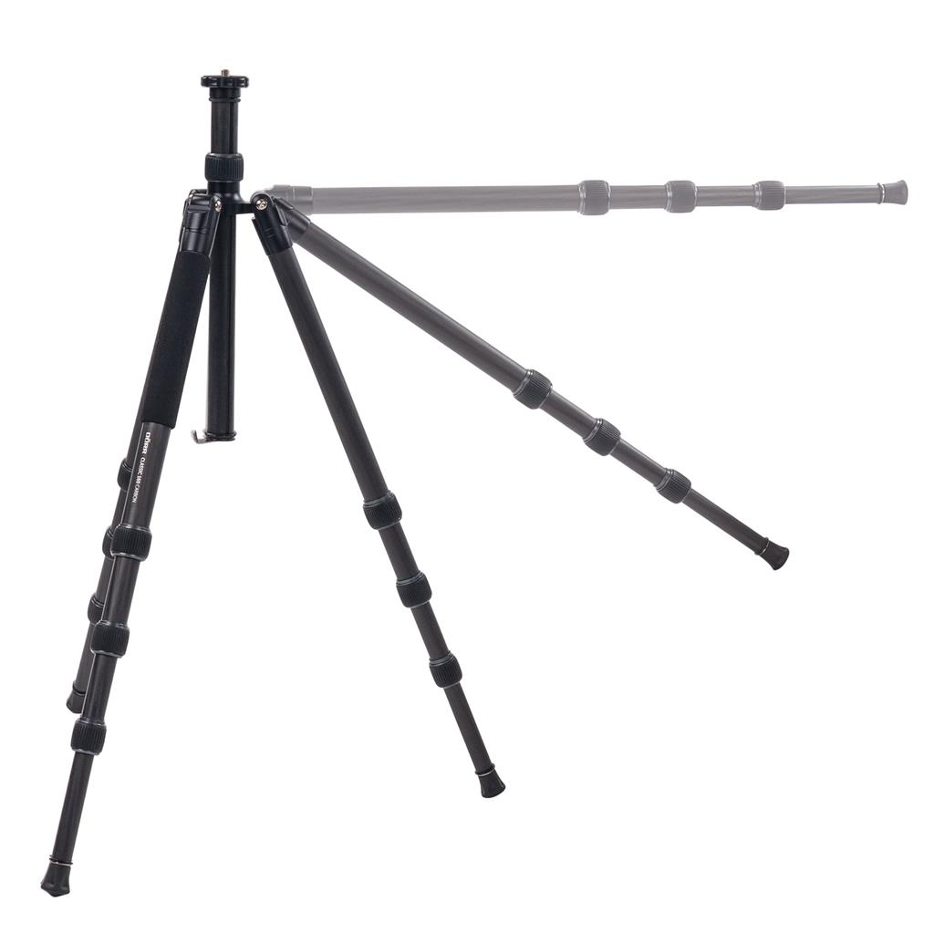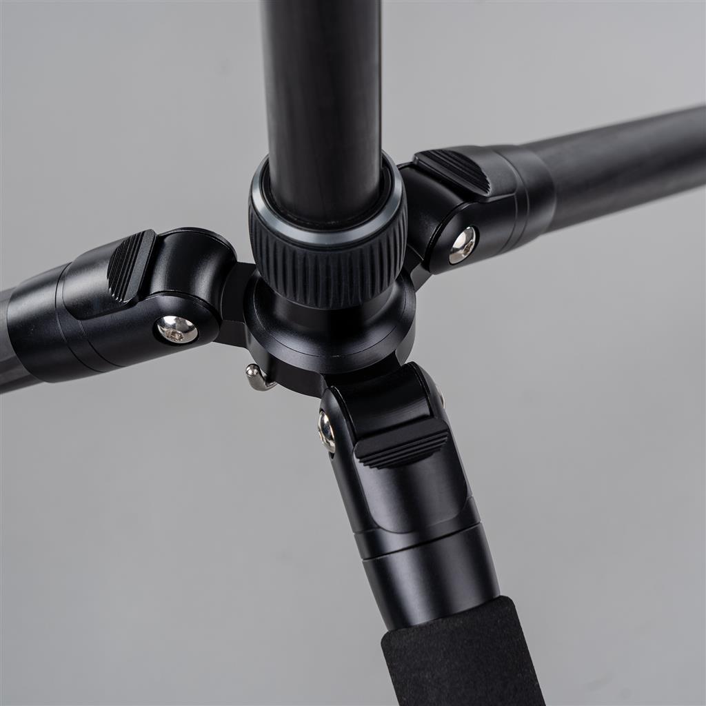 Für den sicheren Stand auf unebenem Untergrund oder im abschüssigen Gelände können die Stativbeine in drei Winkeln arretiert werden. Die vierteiligen Stativbeine können komplett um 180° hochgeklappt werden uns sind so für das kompakte Packmaß von nur 46 cm verantwortlich.