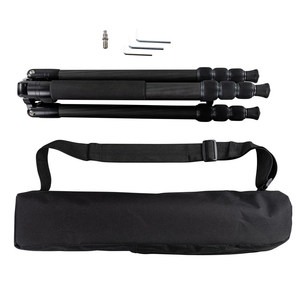 Zur Aufbewahrung und zum Transport wird das Stativ in einer robusten Stativtasche mit Schultergurt geliefert. Die Taschengröße ist so konzipiert, dass das Stativ auch mit einem montierten Kugelkopf in die Tasche passt.