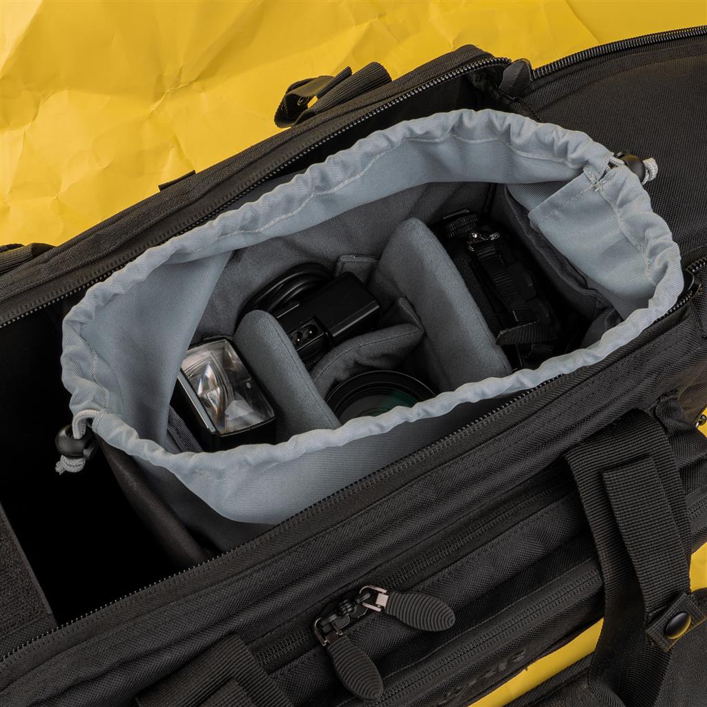 Für den schnellen und ungehinderten Zugriff auf Ihre Ausrüstung stülpen Sie den Deckel nach außen um und packen den Fotoeinsatz offen in Ihre Tasche oder Ihren Rucksack.