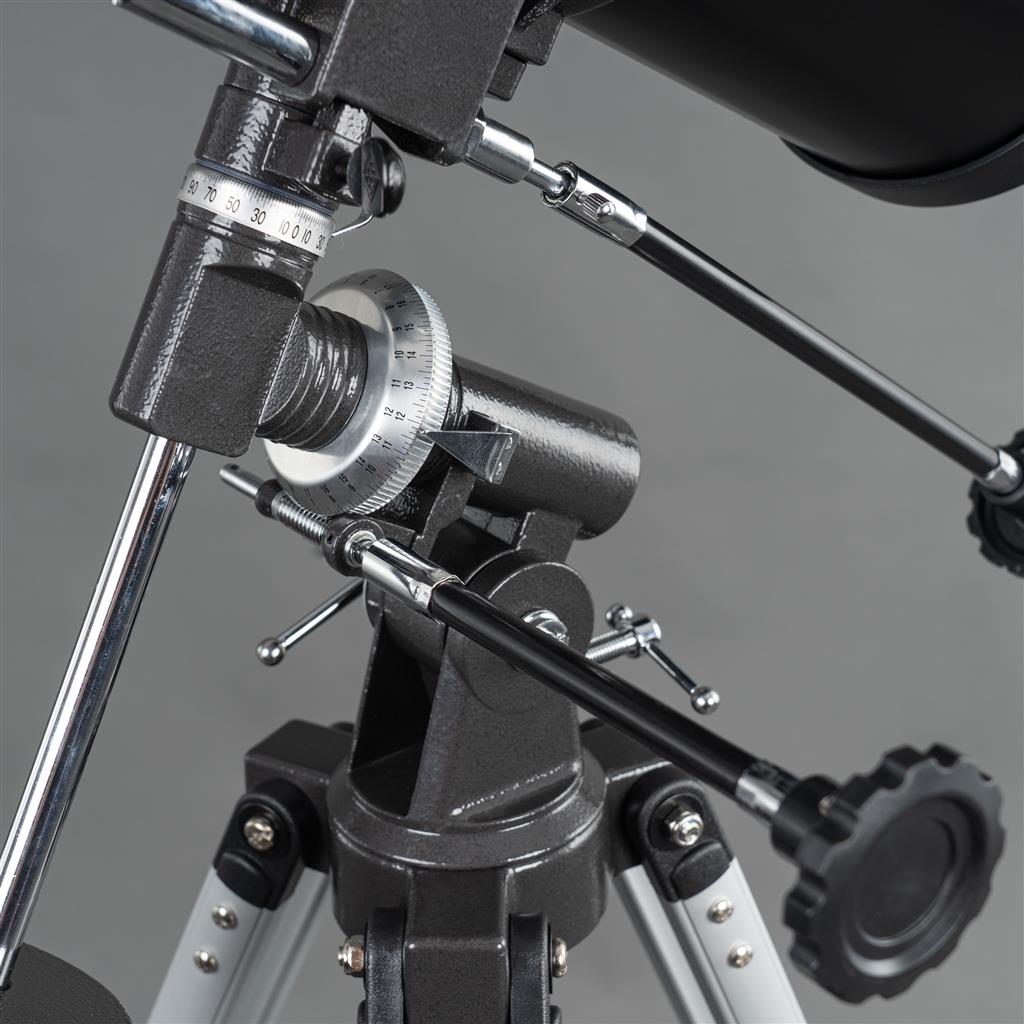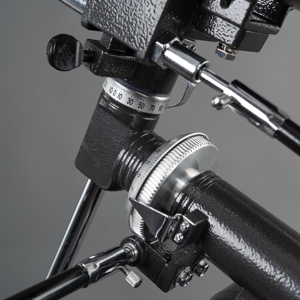The EQ-1 equatorial mount enables the telescope to be aligned and celestial objects to be precisely tracked. The axes are aligned with the Earth's axis. As a result, only one axis has to be moved to compensate for the arc-shaped rotation of the earth. Exact tracking of the celestial bodies to be observed can be carried out evenly. The observation object always remains in the centre of the field of view. Therefore, the EQ-1 equatorial mount is also well suited for high magnifications. The movement of the polar and the declination axis as well as the tracking is done manually via rotary knobs for fine movement, each attached to a flexible shaft. The movable counterweight and the two tube clamps, which allow the telescope to be positioned precisely on the mount, keep the telescope in optimal balance.