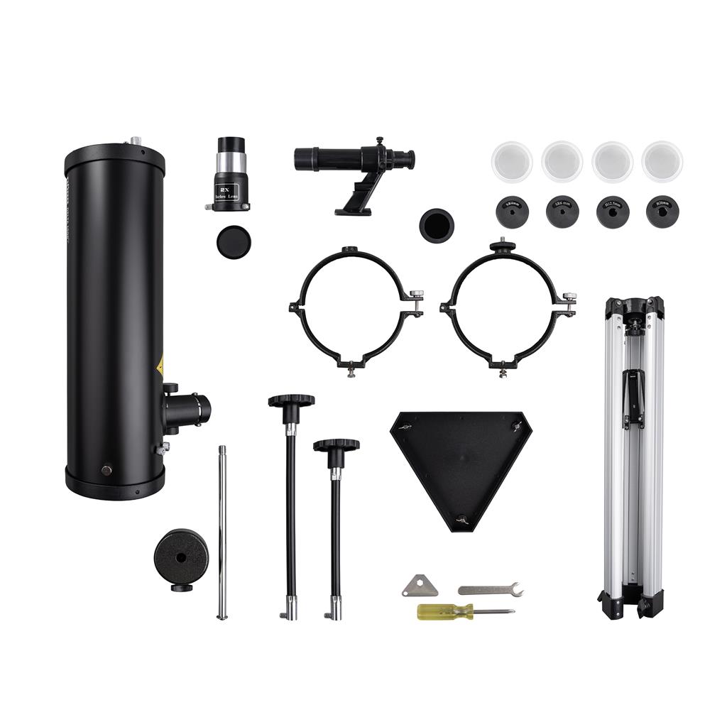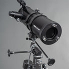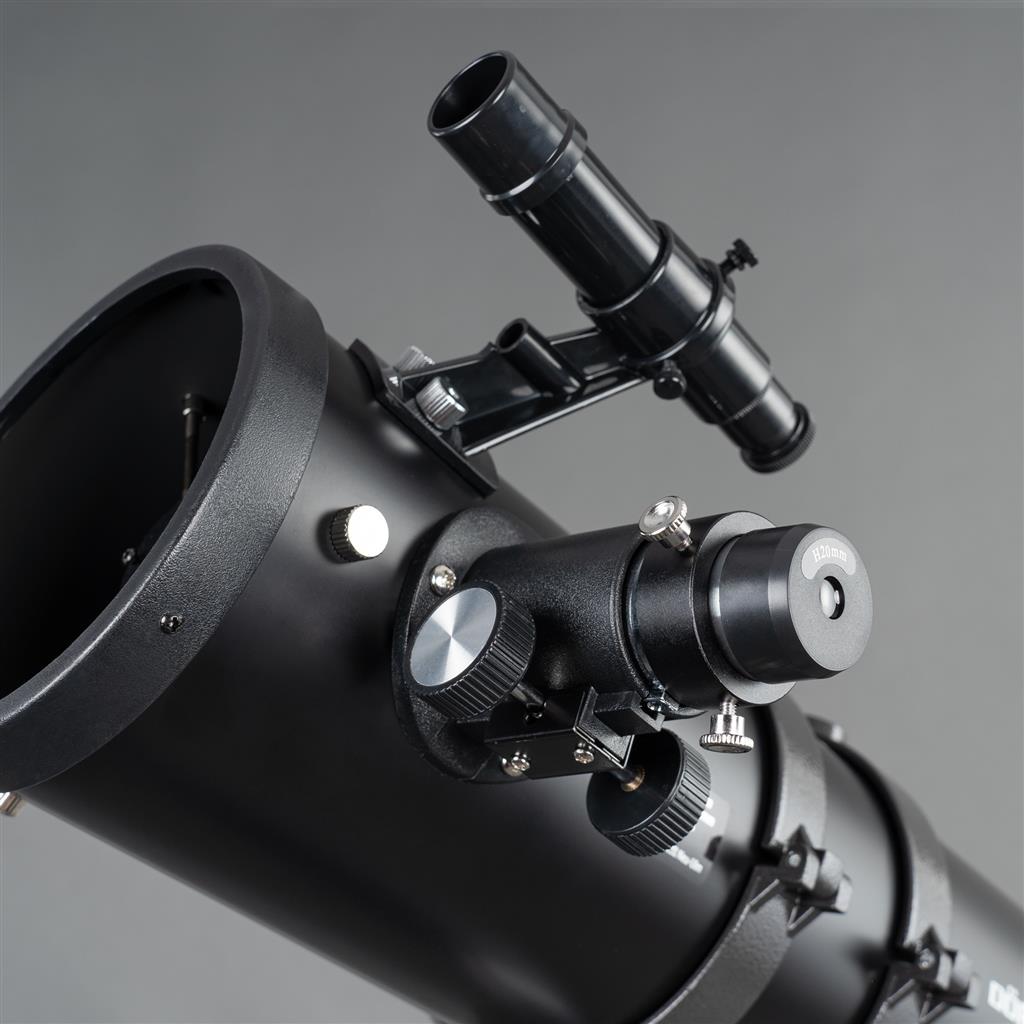 The finder scope is placed parallel to the telescope tube and, after a one-time adjustment, allows you to quickly find the desired celestial objects that you want to observe. A finder scope is necessary because the viewing angle of telescopes is so small due to the high magnification that it is not possible to find celestial objects. Due to the low magnification of only 5x, the finder scope captures a larger area of the sky, making it easier to quickly align the telescope to the desired object.