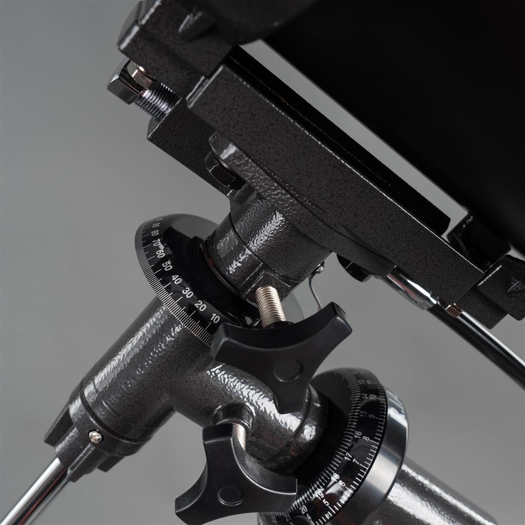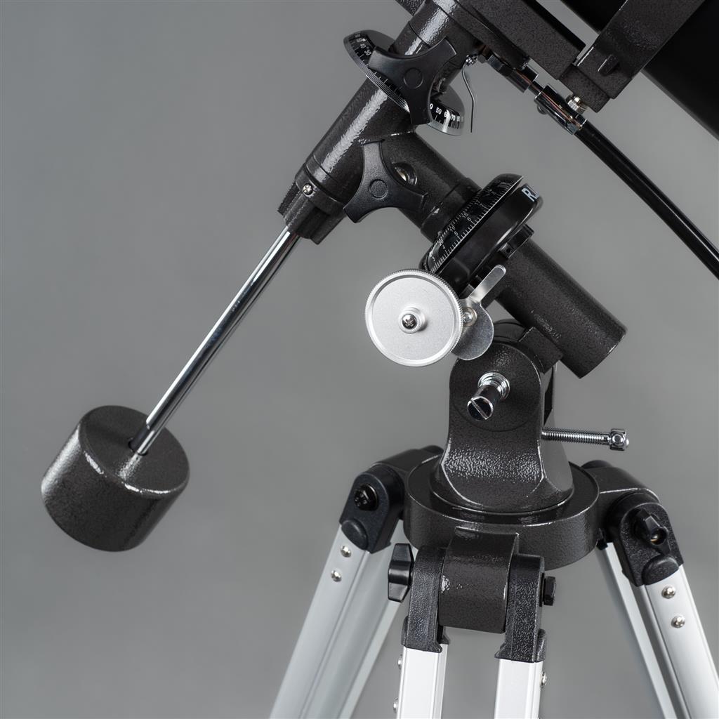 The EQ-2 equatorial mount enables the telescope to be aligned and celestial objects to be precisely tracked. The axes are aligned with the Earth's axis. As a result, only one axis has to be moved to compensate for the arc-shaped rotation of the earth. Exact tracking of the celestial bodies to be observed can be carried out evenly. The observation object always remains in the centre of the field of view. Therefore, the EQ-2 equatorial mount is also well suited for high magnifications. The movement of the polar and the declination axis as well as the tracking is done manually via rotary knobs for fine movement, each attached to a flexible shaft. The movable counterweight and the two tube clamps, which allow the telescope to be positioned precisely on the mount, keep the telescope in optimal balance.