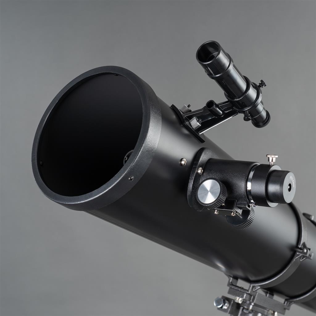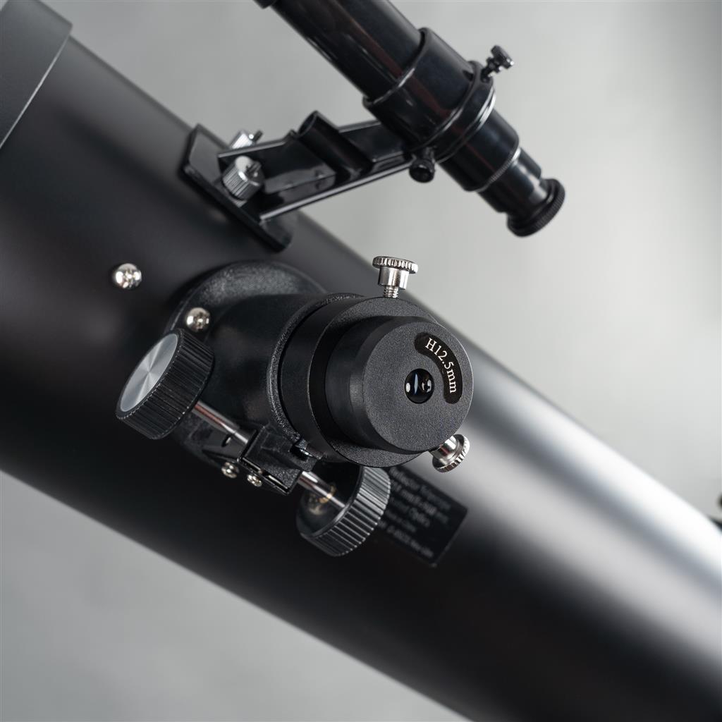 The finder scope is placed parallel to the telescope tube and, after a one-time adjustment, allows you to quickly find the desired celestial objects that you want to observe. A finder scope is necessary because the viewing angle of telescopes is so small due to the high magnification that it is not possible to find celestial objects. Due to the low magnification of only 5x, the finder scope captures a larger area of the sky, making it easier to quickly align the telescope to the desired object.