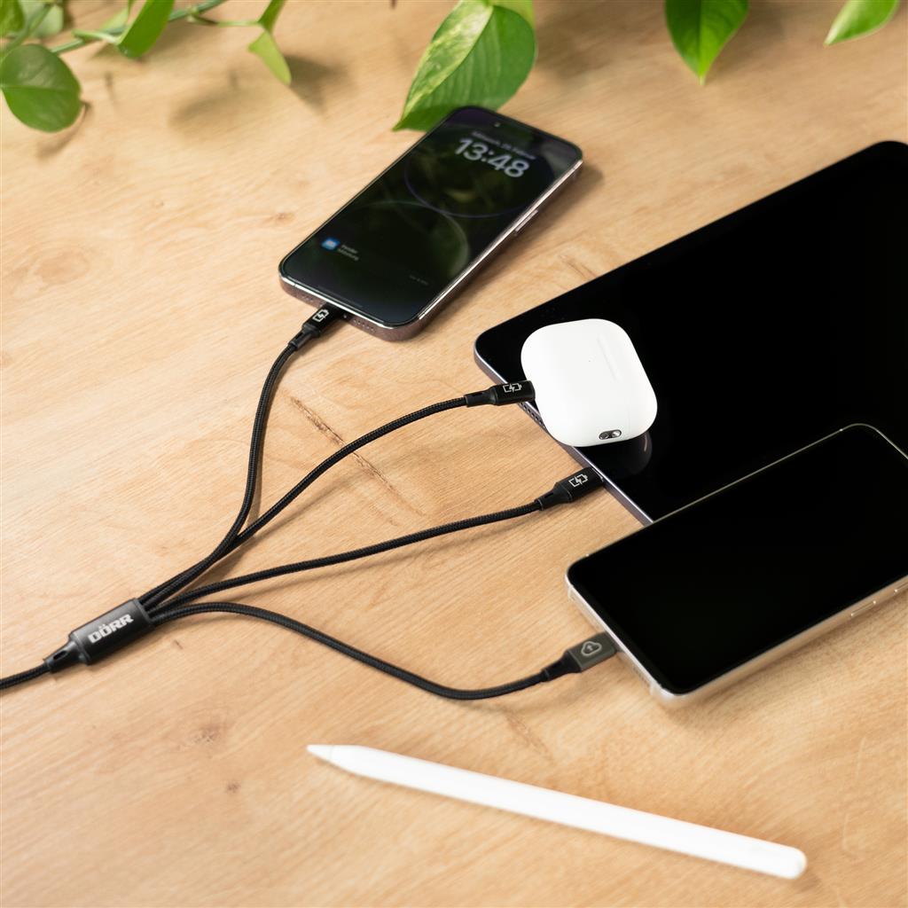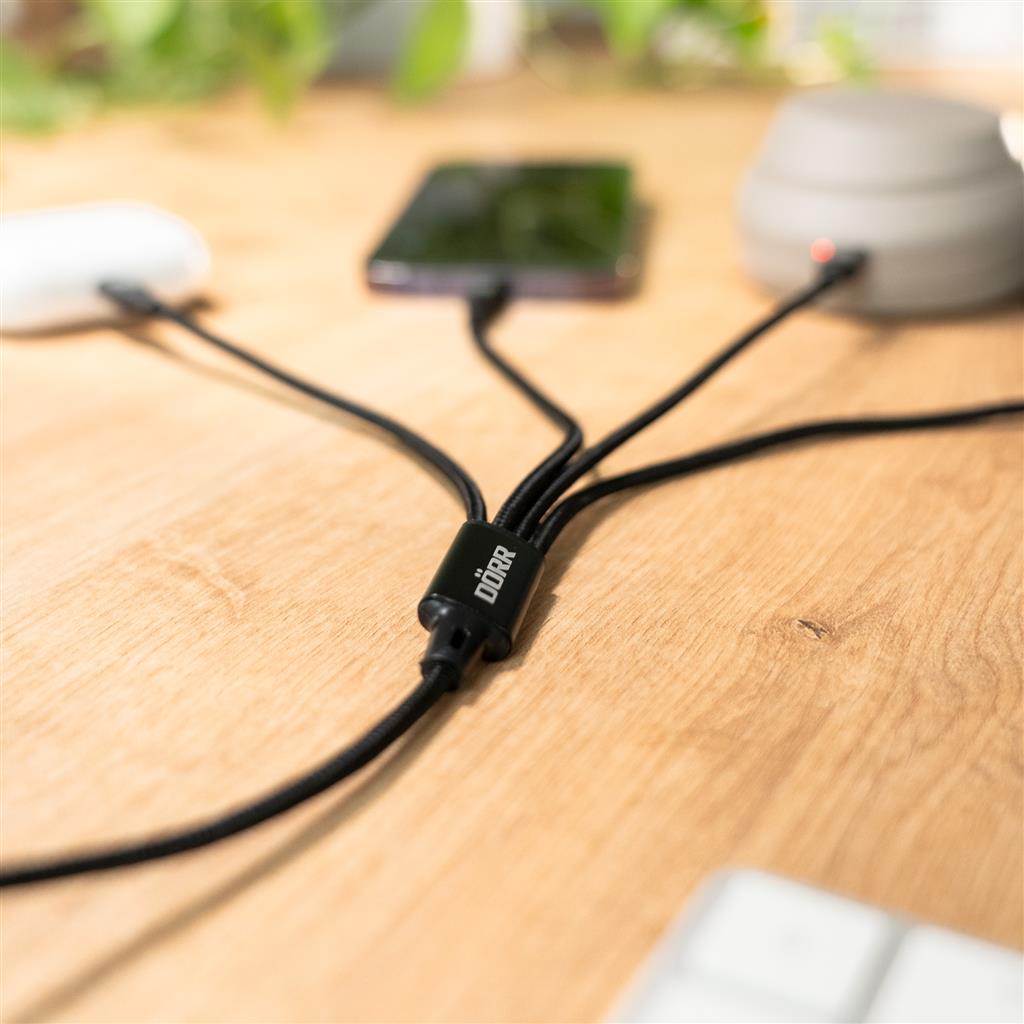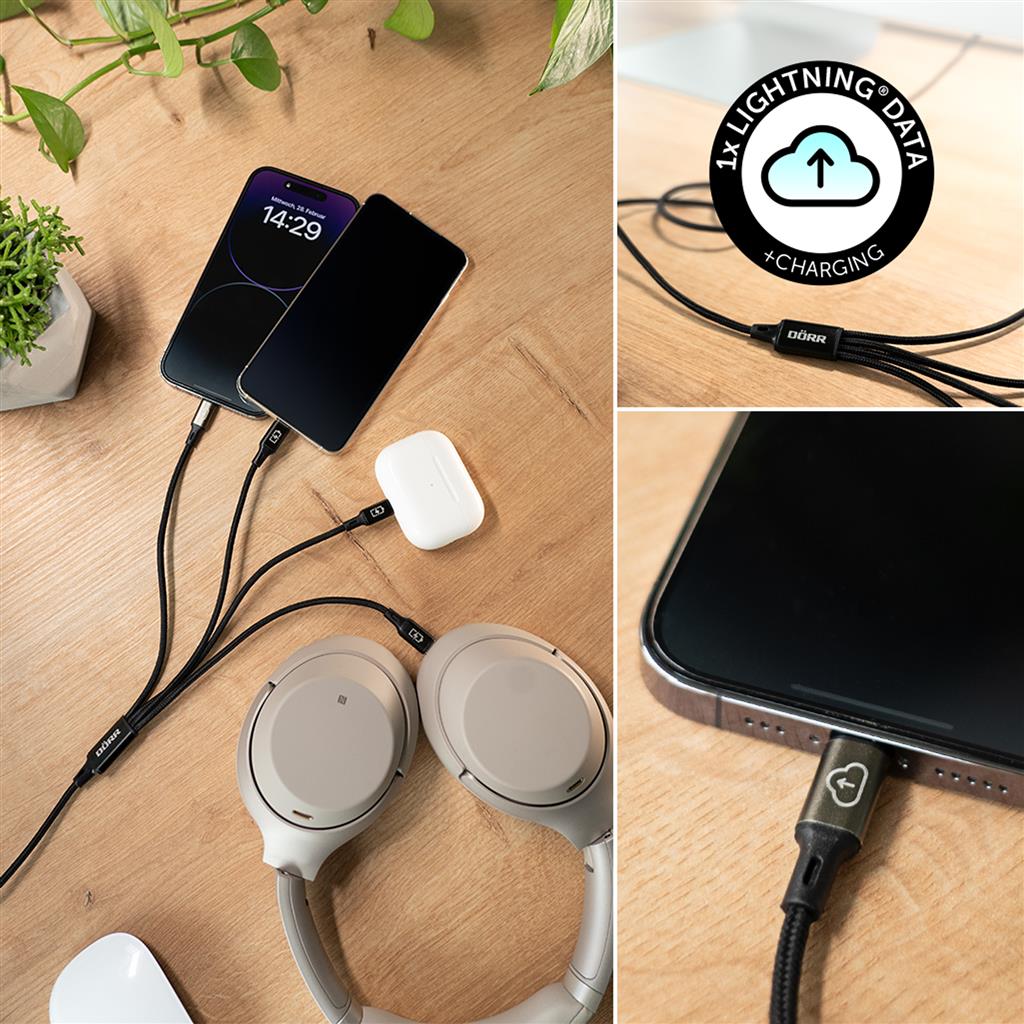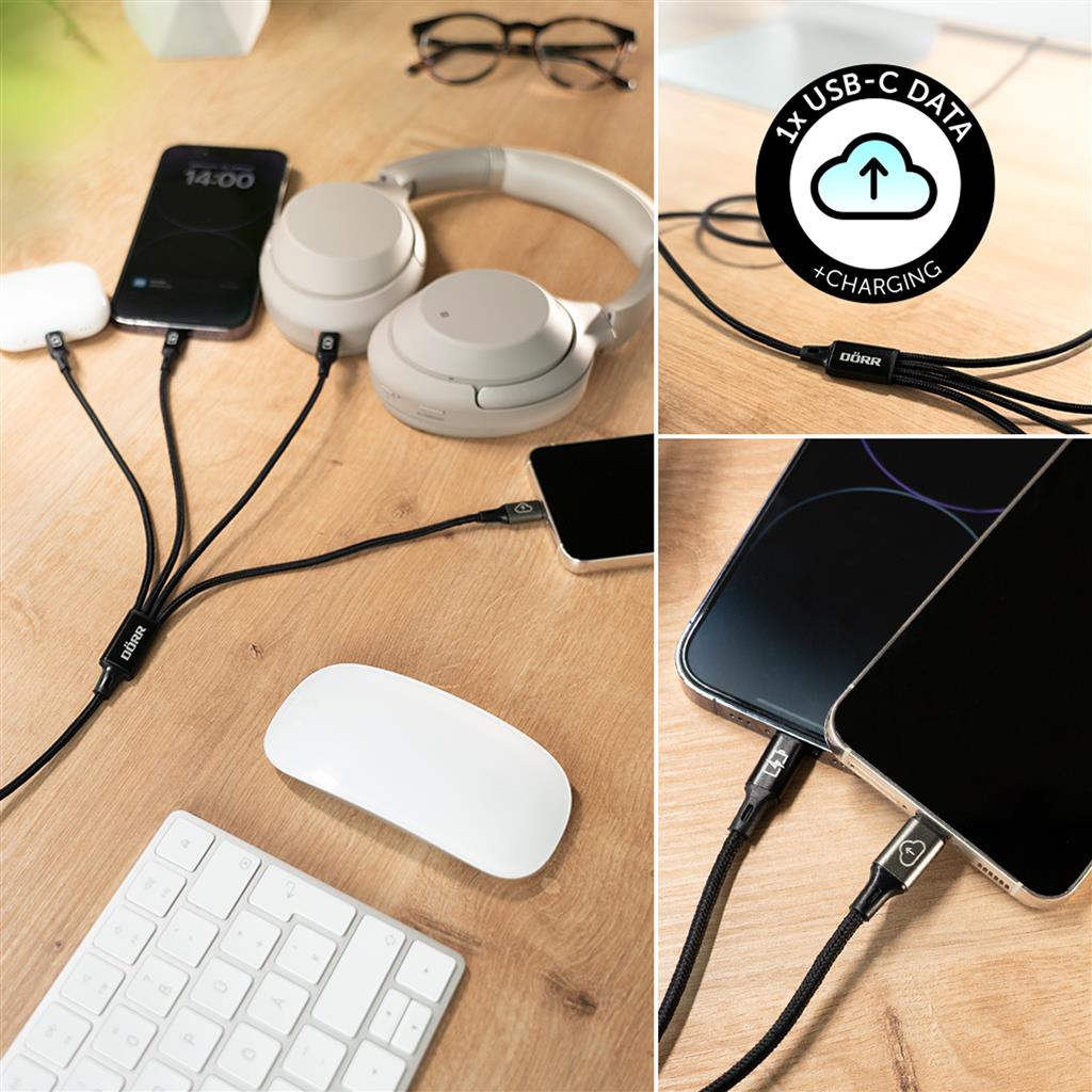 Are you tired of having to deal with a tangle of cables for your various devices? There's an end to that! Our brand new DÖRR 4-in-1 USB-C data and charging cable with Lightning® charging connectors is here to simplify your life.