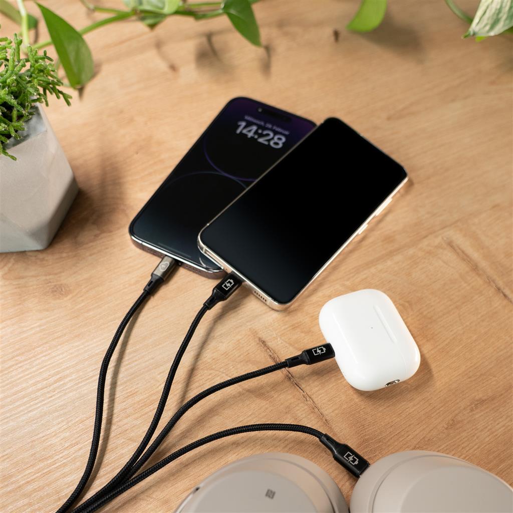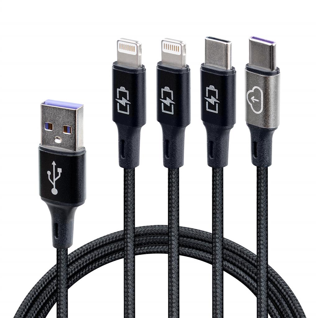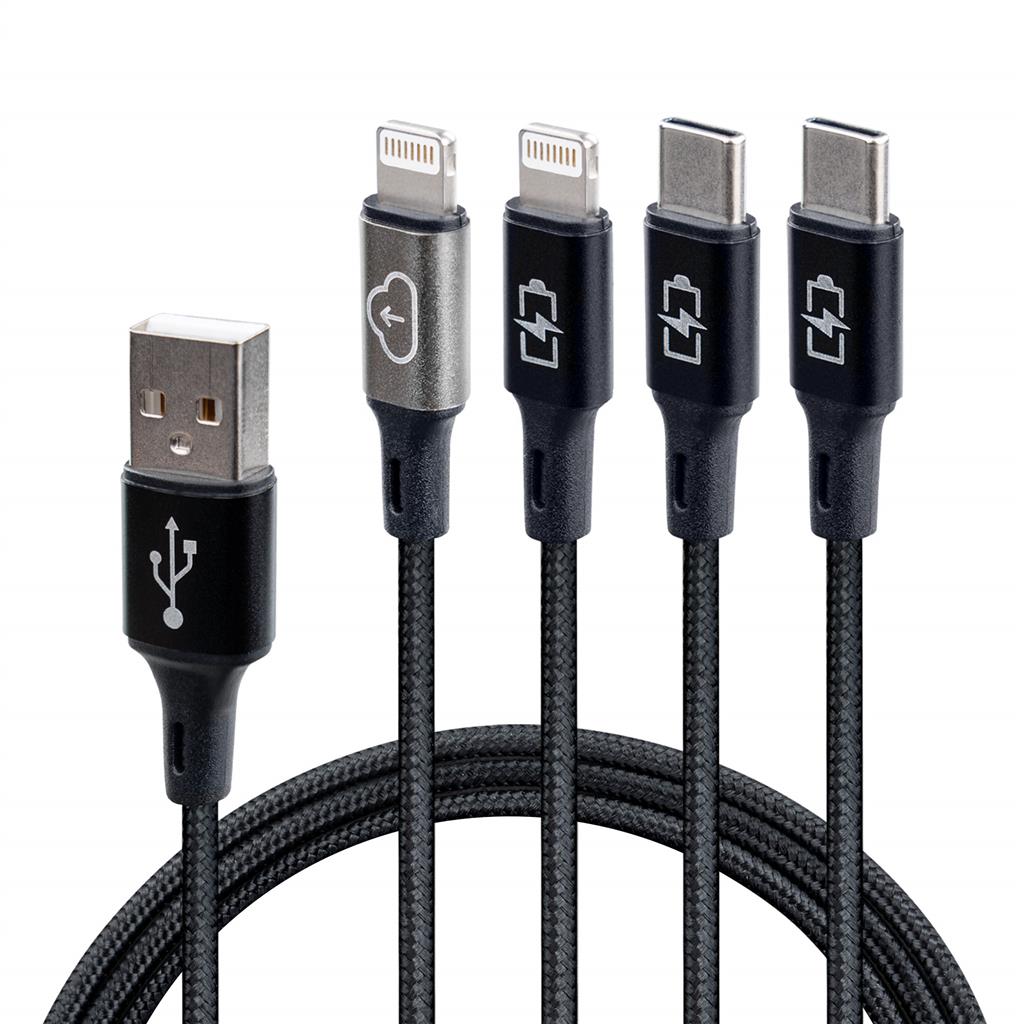 Our innovative USB cable combines a  USB-C data cable , a USB-C charging cable and two Lightning® charging cables for your Android and Apple devices.