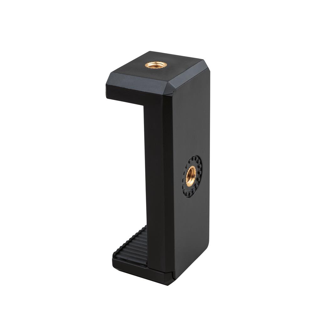 The variable smartphone holder fits for smartphones with a width of 70 to 90 mm. The smartphone is simply inserted between two clamps. Furthermore, the smartphone holder is equipped with a universal hot shoe with a ¼“ tripod thread, on which you can mount the supplied LED light, the microphone or the tripod.