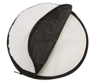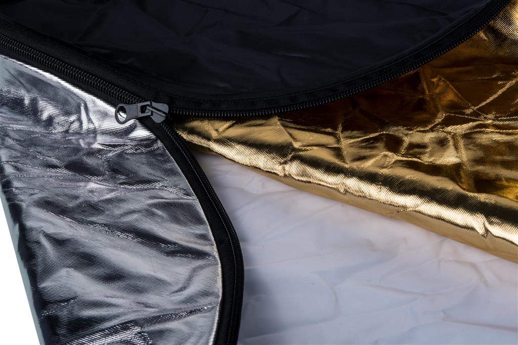 The base is a round shaped diffusor covered with neutral, transparent fabric. When holding the diffusor between the subject and the sun, the light becomes more diffuse. The diffusor converts hard sunlight into pleasantly soft light, perfectly suited for portrait shootings. For reflections, the respective reflector cover can be pulled over the diffusor and closed with a zipper. Depending on the used reflector cover, you can choose how you want to reflect the light: