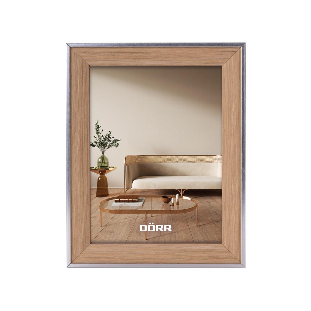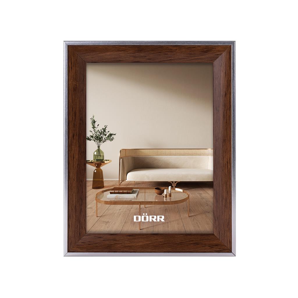 The DÖRR frame series "Villa" consists of modern plastic frames with a wood look. The slightly raised, silver edges create a clear, subtle contrast to the warm wood tones. The frame strip itself is smooth and comes with a matt finish.