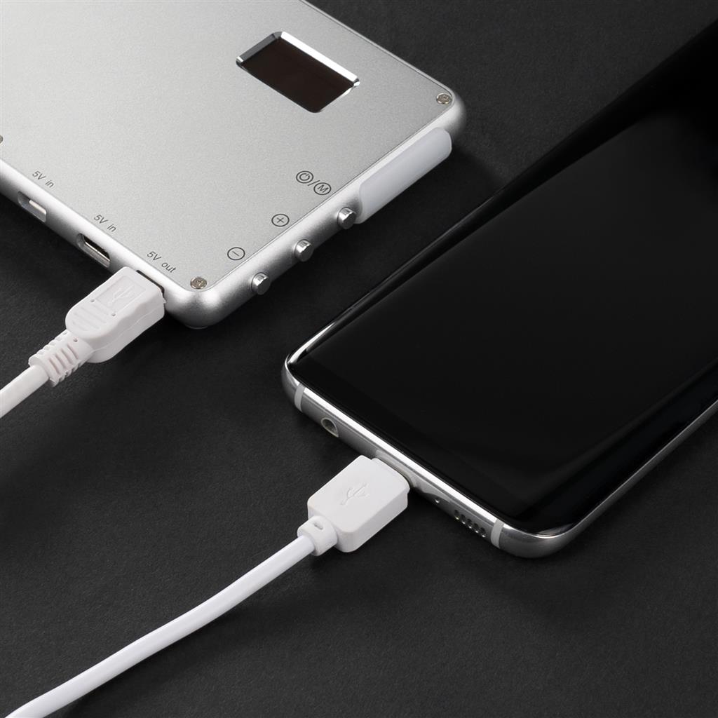 The incorporated powerbank function allows you to charge external devices such as smartphones and tablets with help of the supplied Mini USB charging adapter. You may use the powerbank function without turning on the video light. It is also possible to use the video light at 100% power and charge an external device at the same time but this drains the battery empty more quickly.