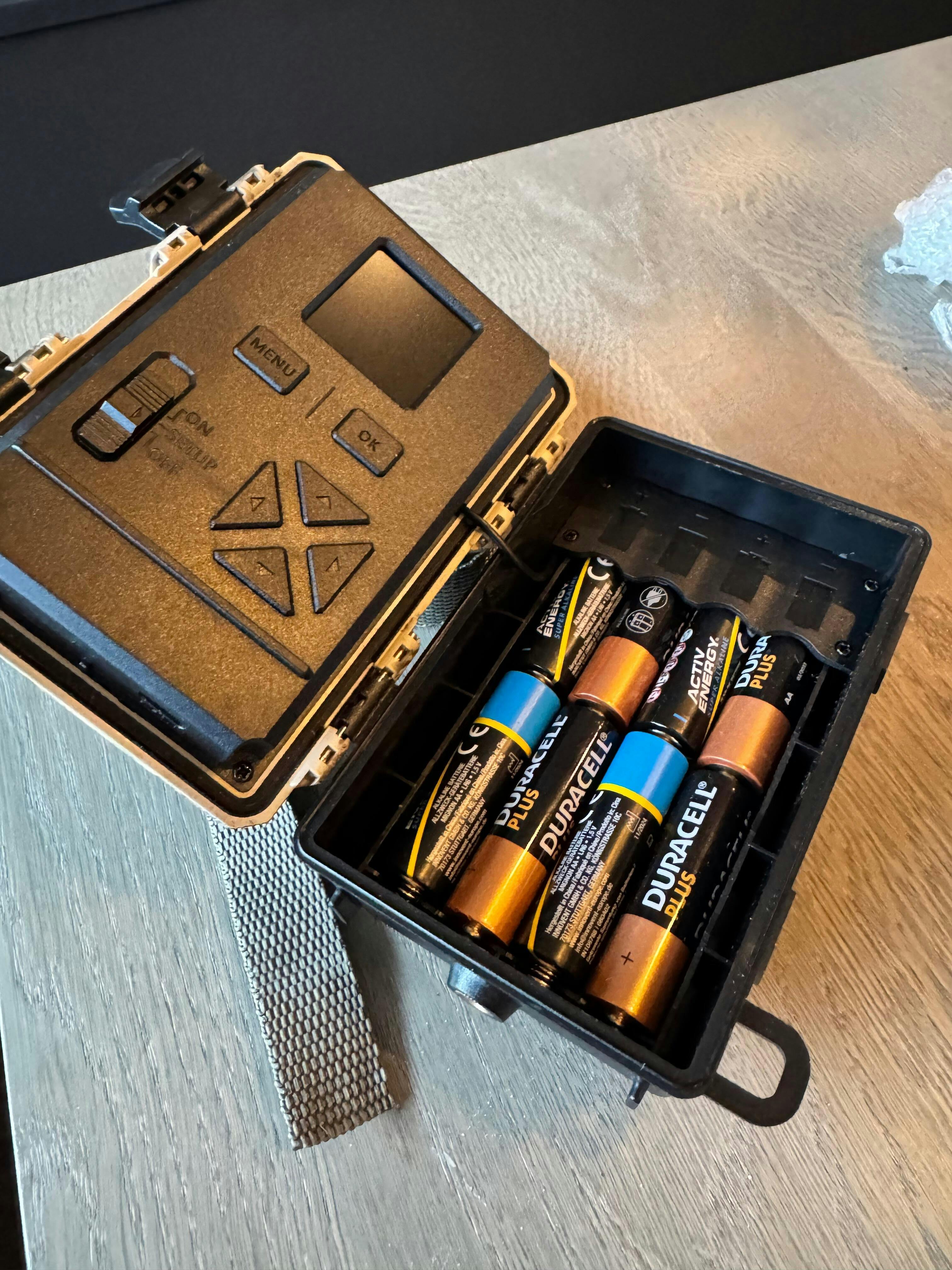 The camera requires 8 AA LR6 1.5V alkaline batteries for operation (not included). The runtime in standby mode is up to 8 months (depending on camera settings, temperature, battery quality, etc.). You can find suitable batteries and inexpensive value packs here. Besides operation with conventional AA batteries, the camera allows the use of an external rechargeable battery together with a battery cable. You can find everything you need for an alternative power supply in our shop: