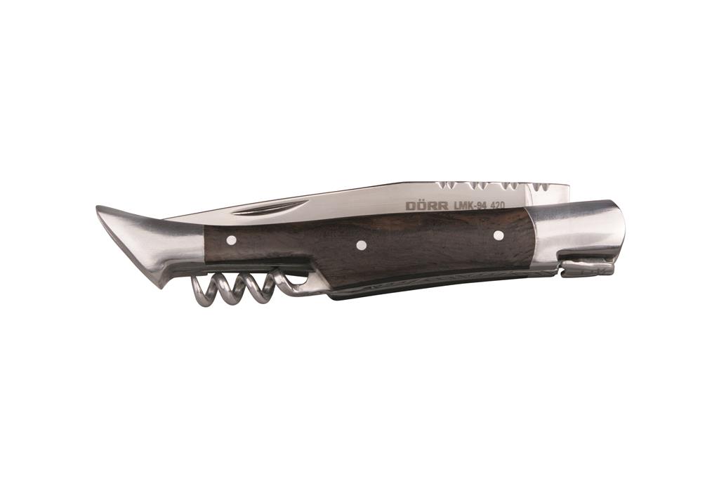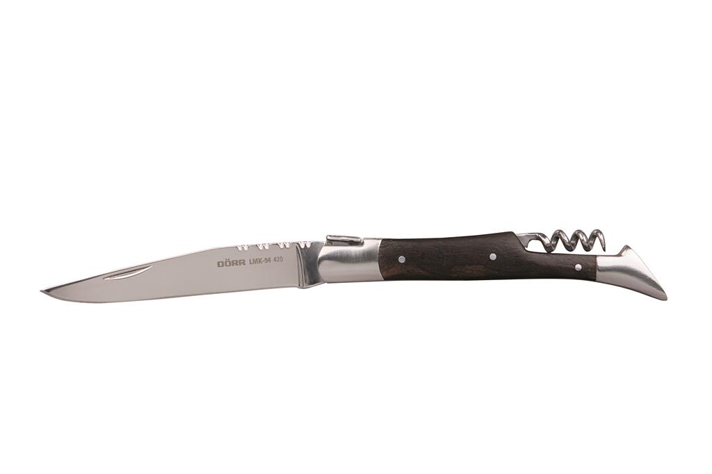 Allzweckmesser im Laguiole Design mit Holzgriffschale und integriertem Korkenzieher. Gefertigt aus 420er Messerstahl mit einer Klingenstärke von 2,8 mm. Klingenlänge 94 mm; Gewicht 91 g.
