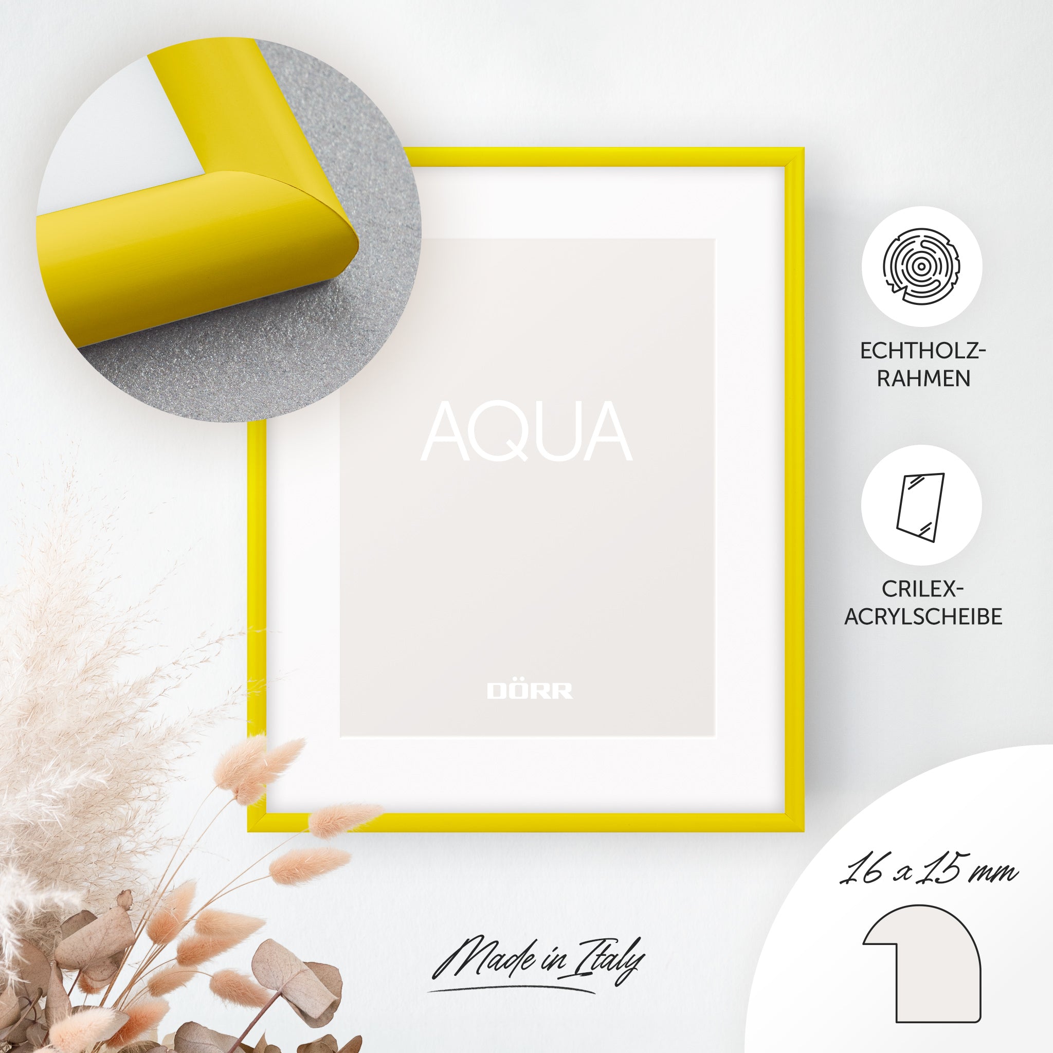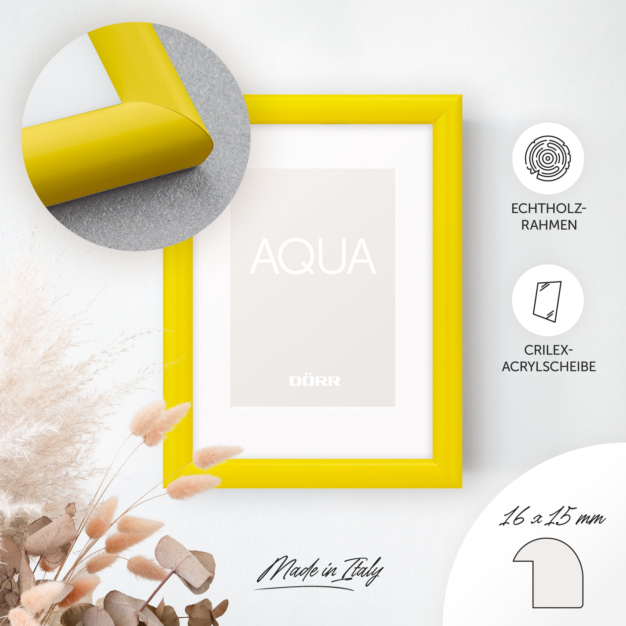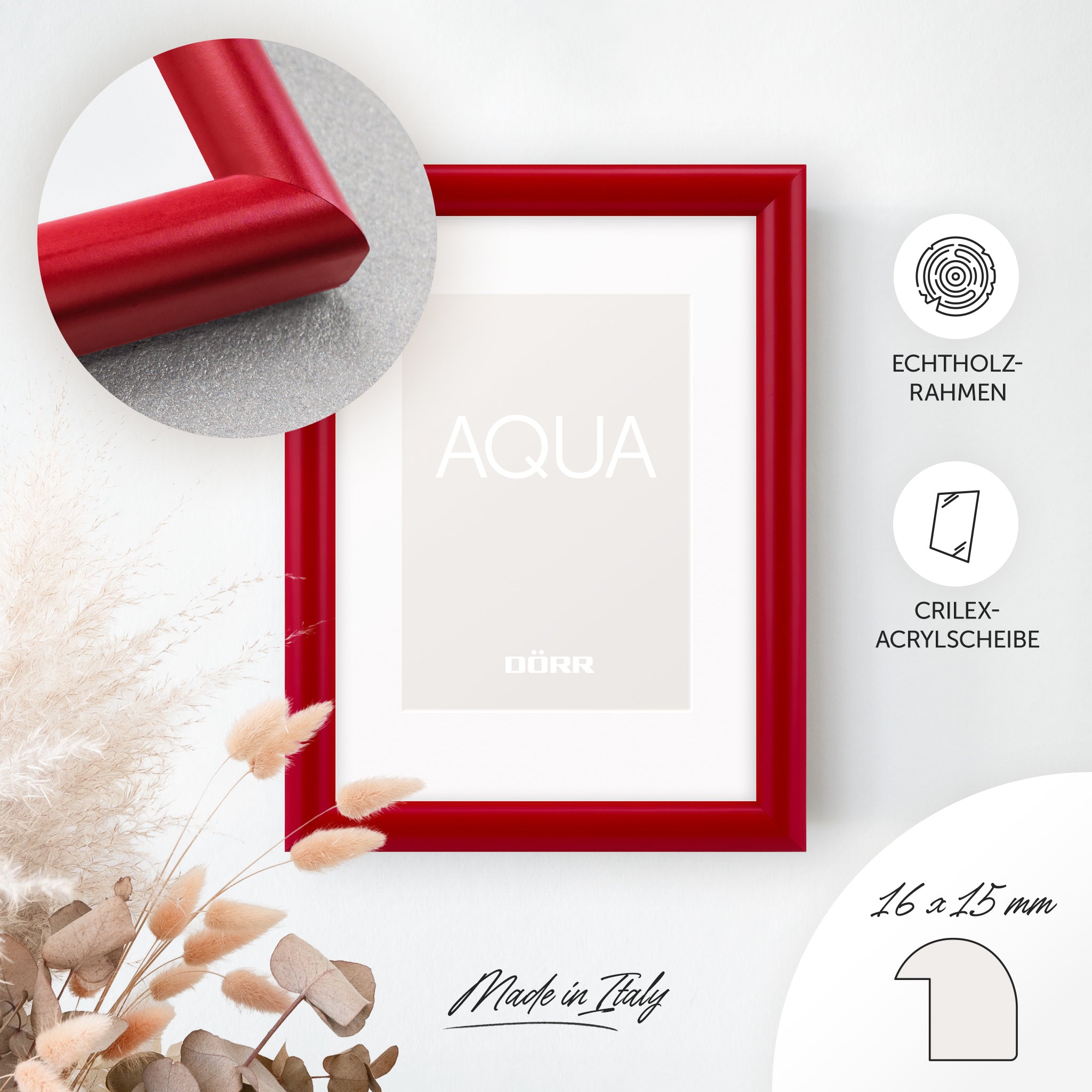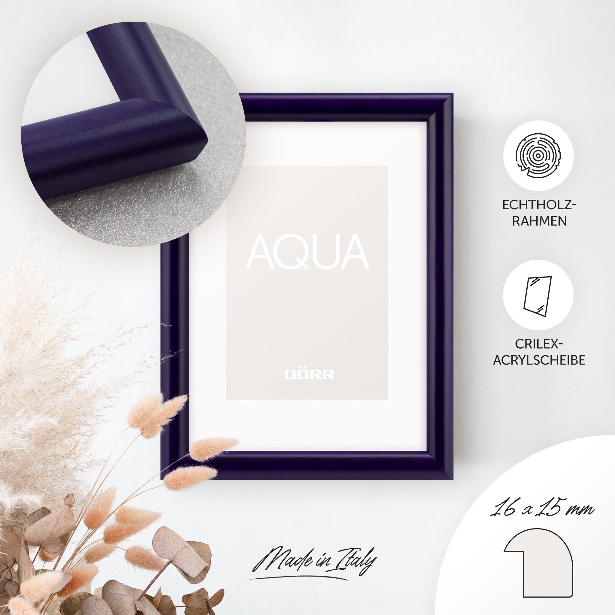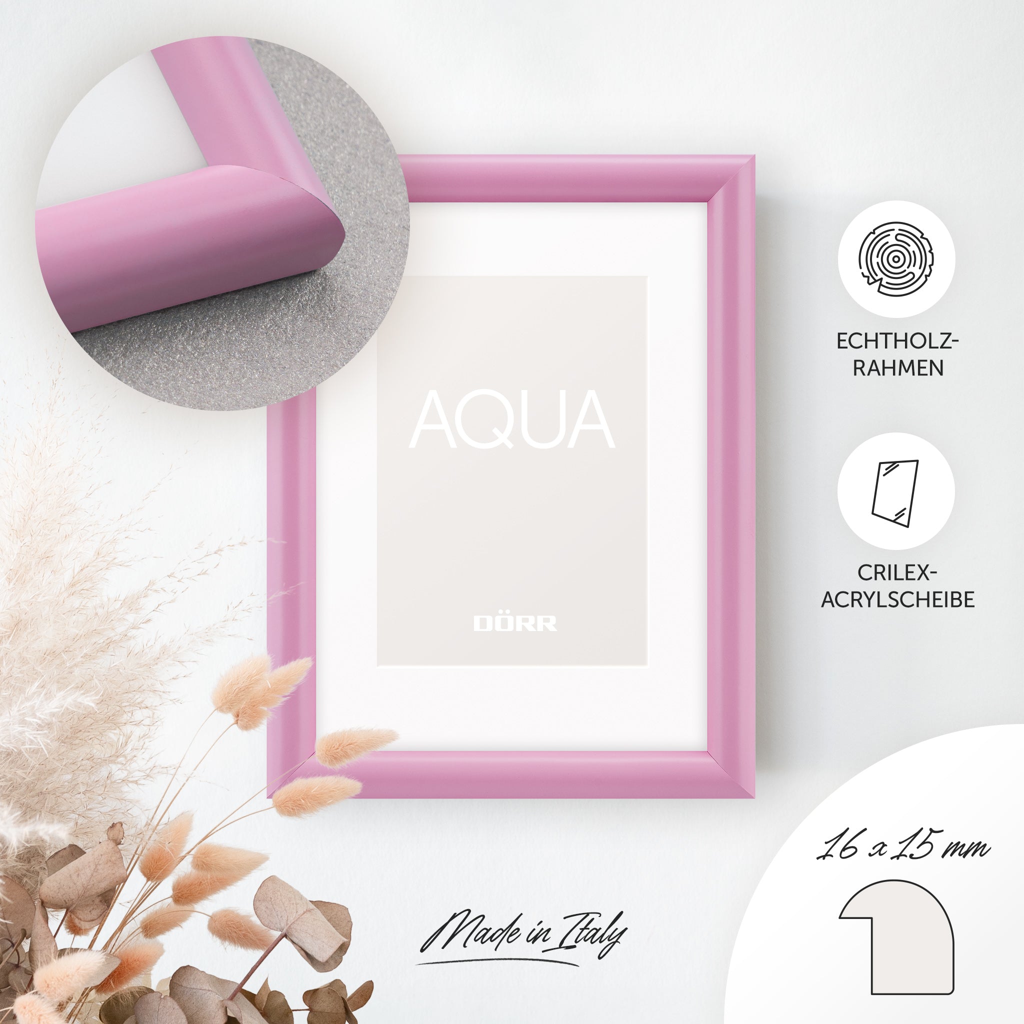 Add stylish accents to your home with the DÖRR Aqua picture frame series. The rounded, minimalist frame profile made of solid wood (16 mm wide, 15 mm high) highlights your photos naturally, giving them a lively and expressive appearance – perfect for favourite memories, travel photos or family moments.