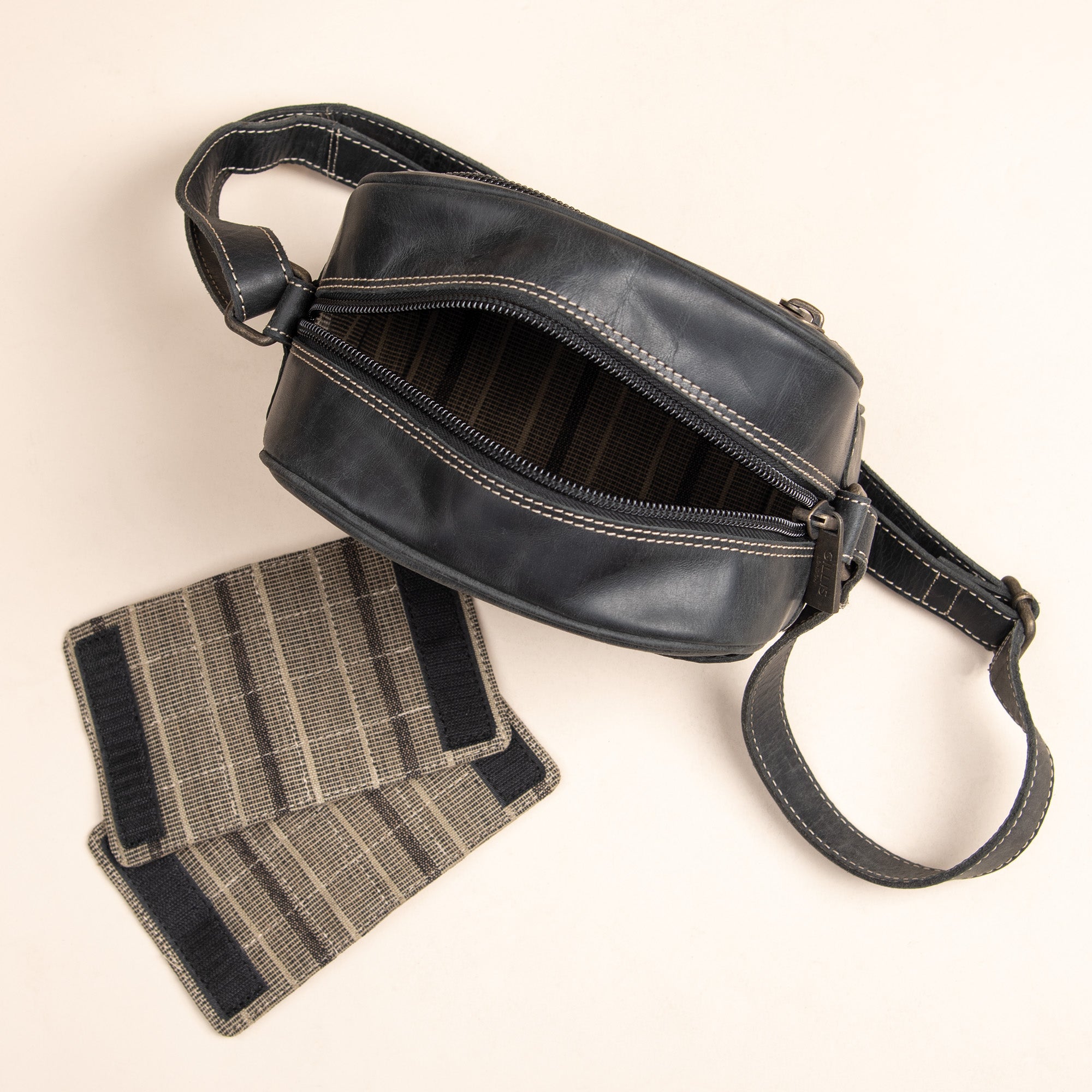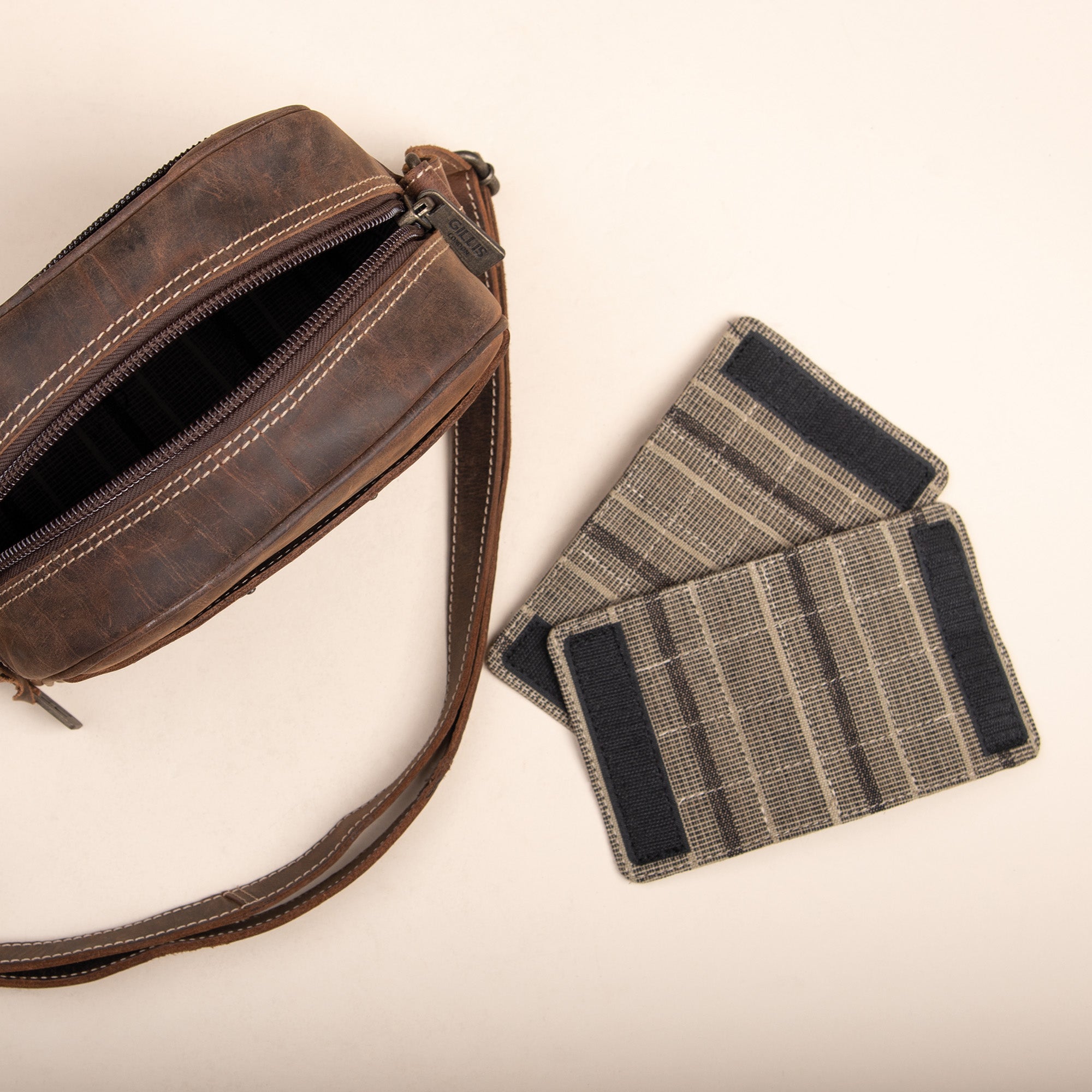 Velcro strips inside the photo bag allow to insert the supplied dividers according to your own demands. The flexible dividers are covered with the same cotton fabric as the inner lining and guarantee optimal protection for your photo equipment.