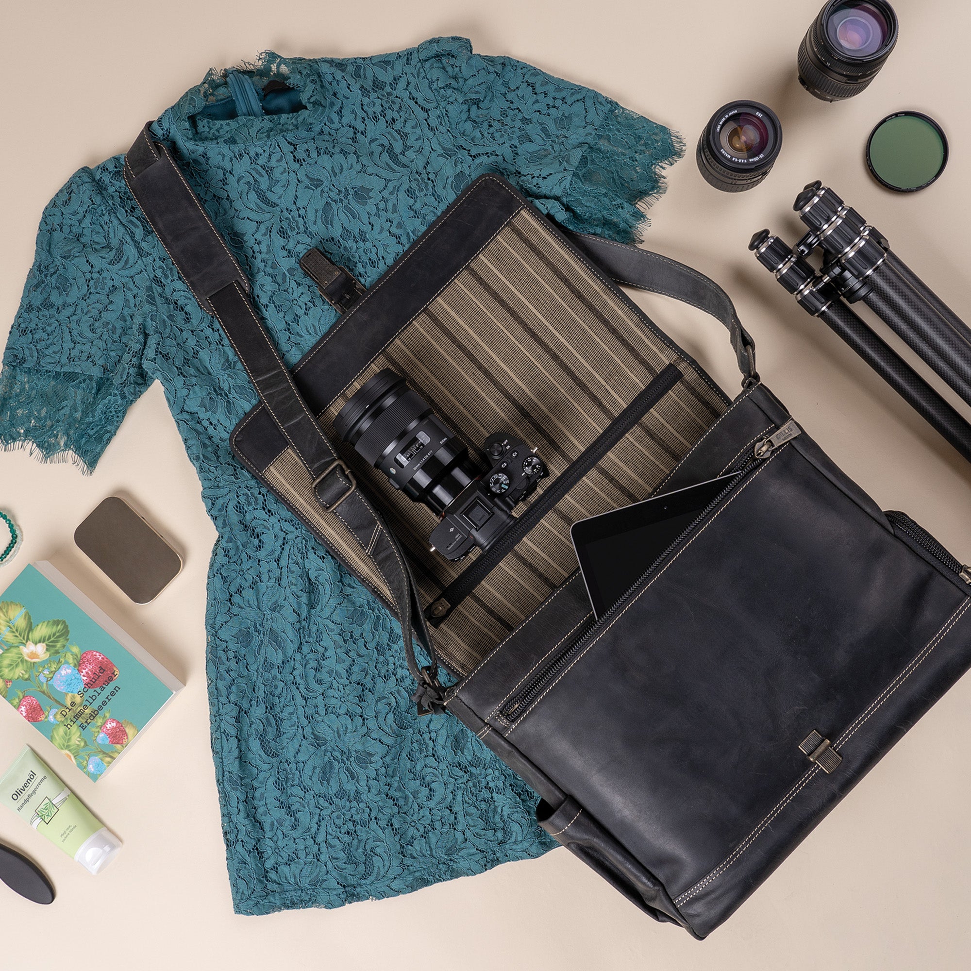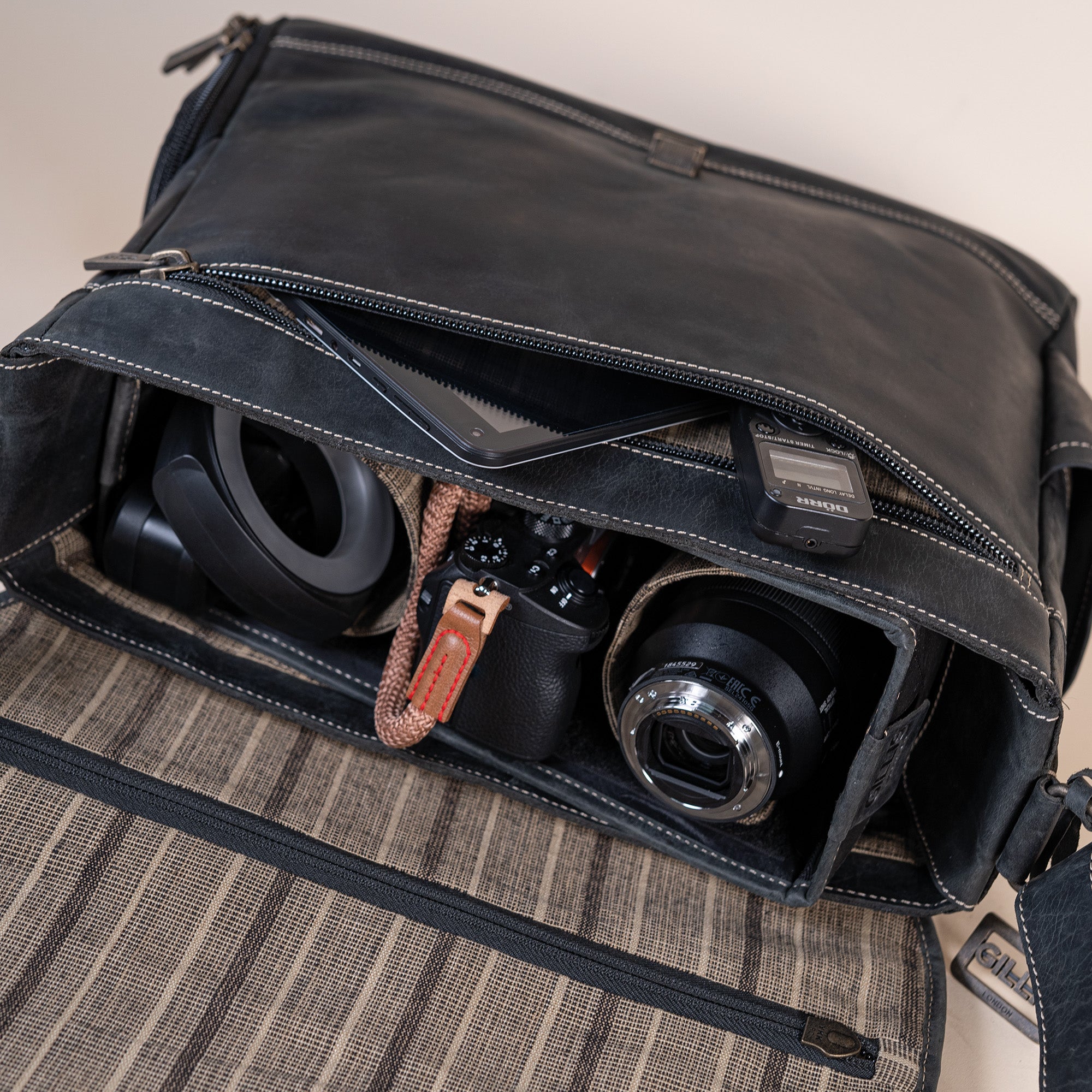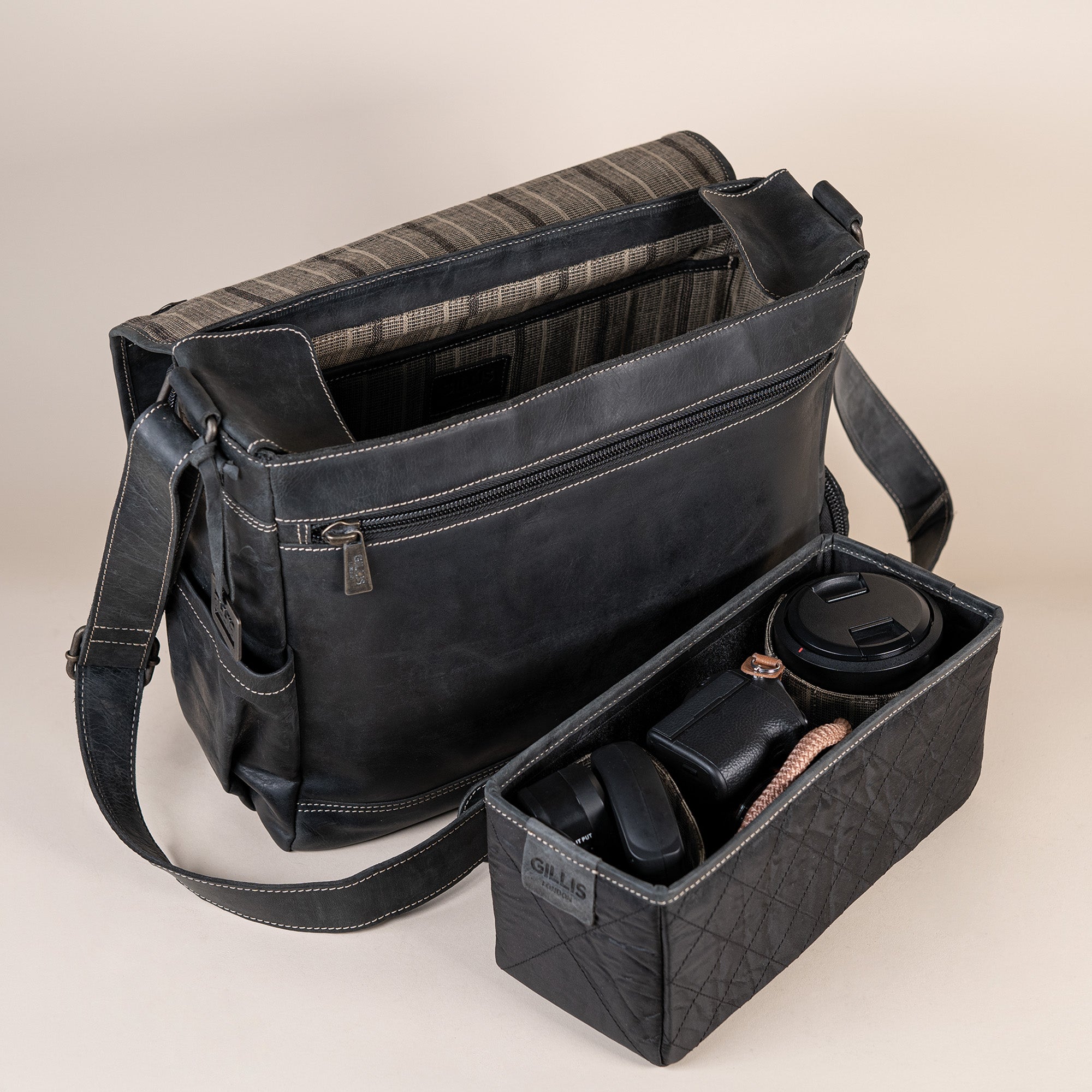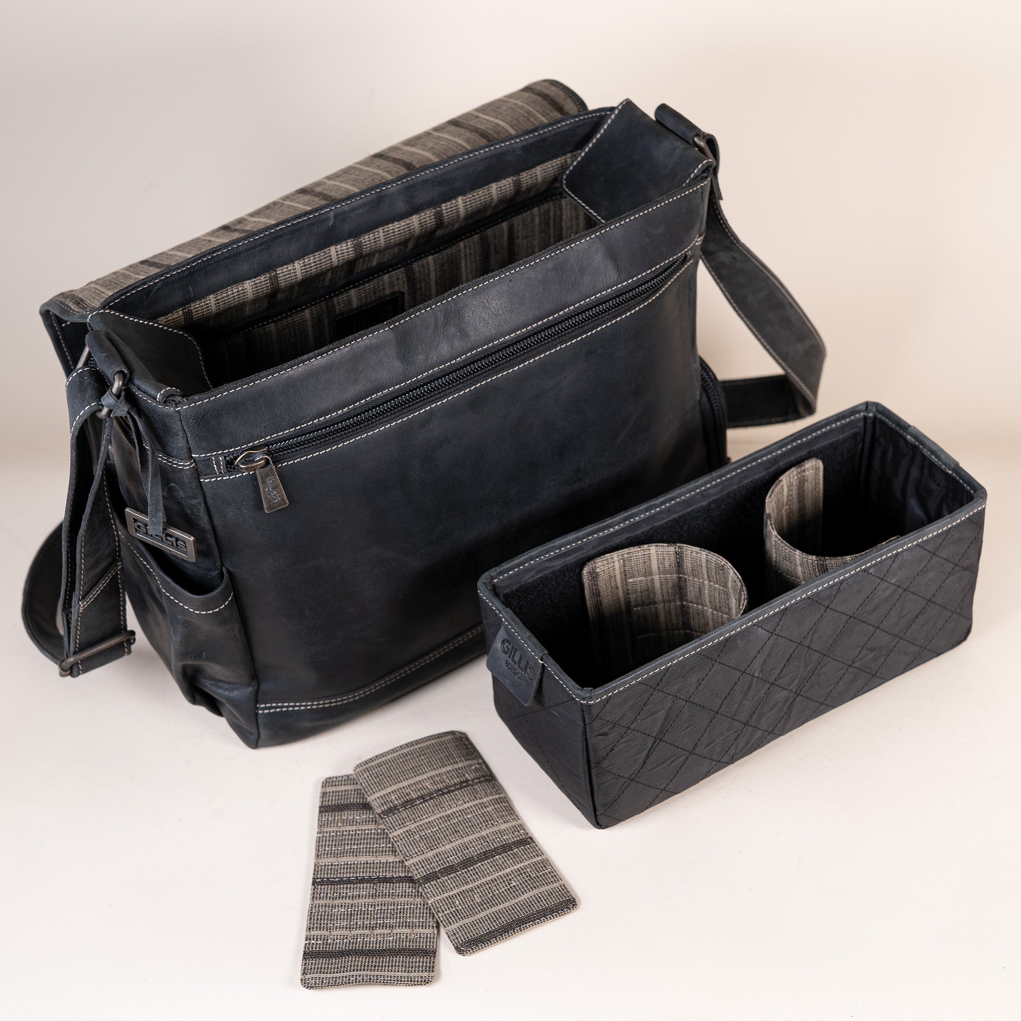 If you do not want to take your photo equipment with you, you can simply remove the bridge and the photo tray. Now you have spacious inner compartment and can use the bag as a regular messenger bag. Your photo equipment is safely stowed in the photo tray and can be kept separately. The lid closes the photo tray completely and protects your camera from dust.