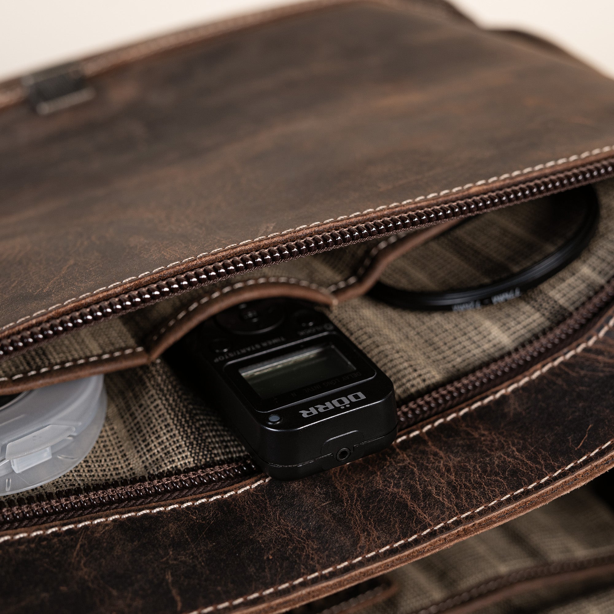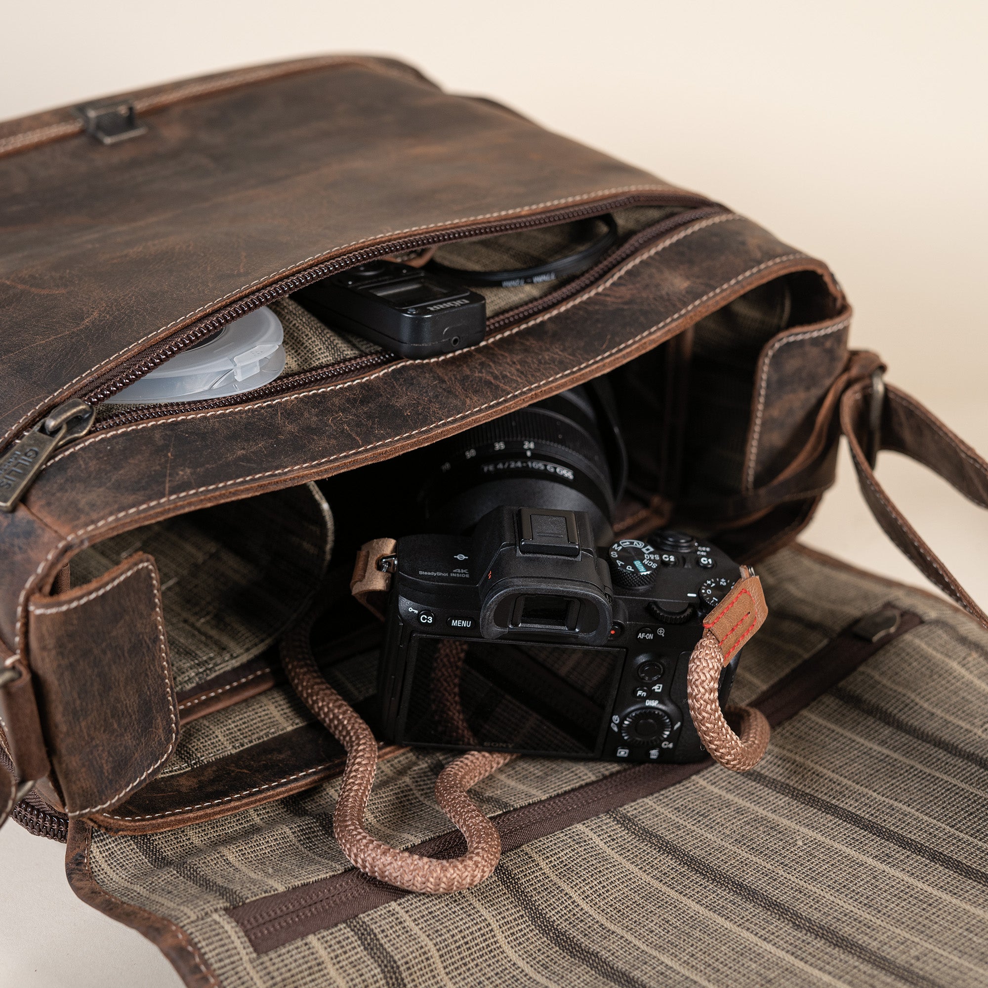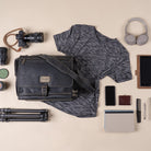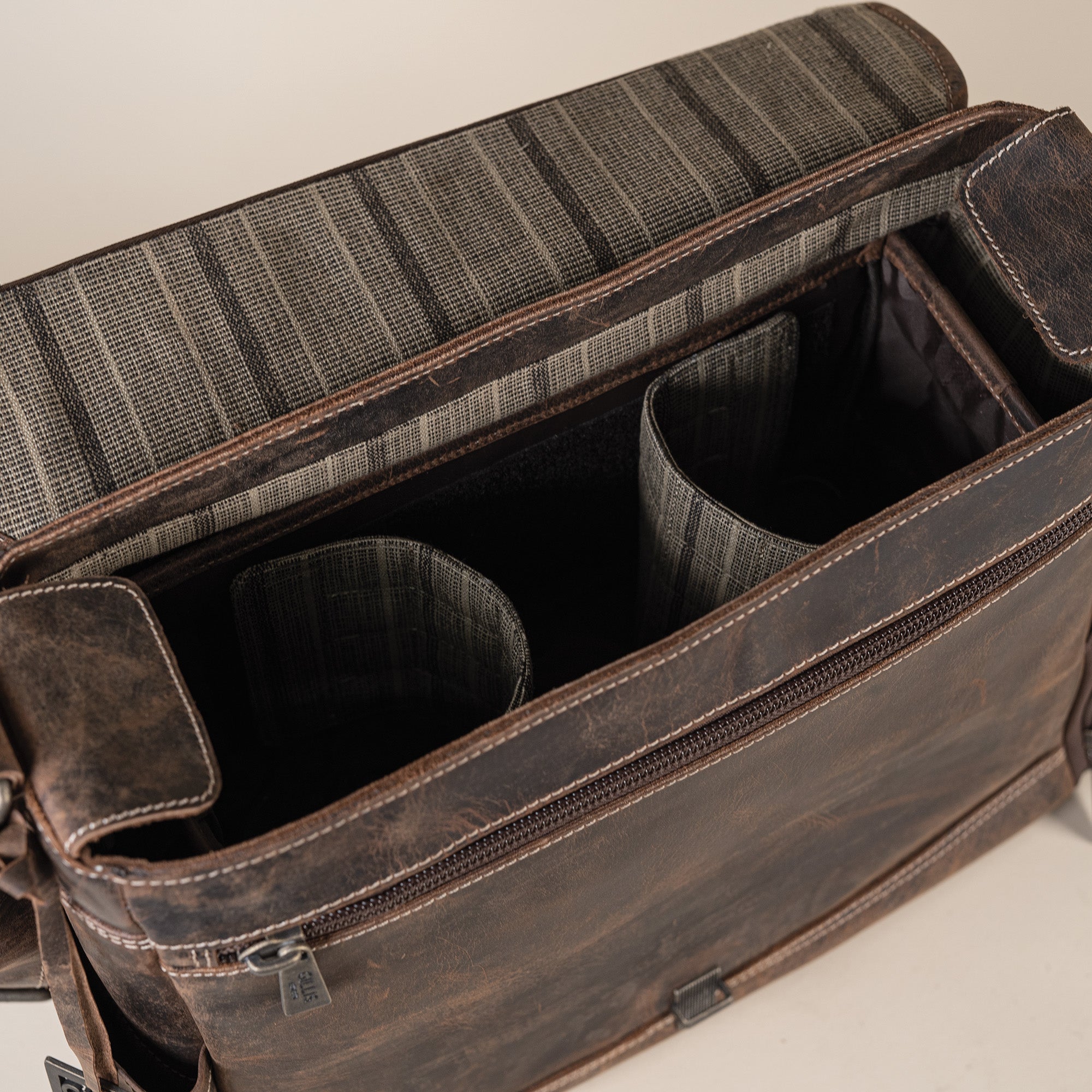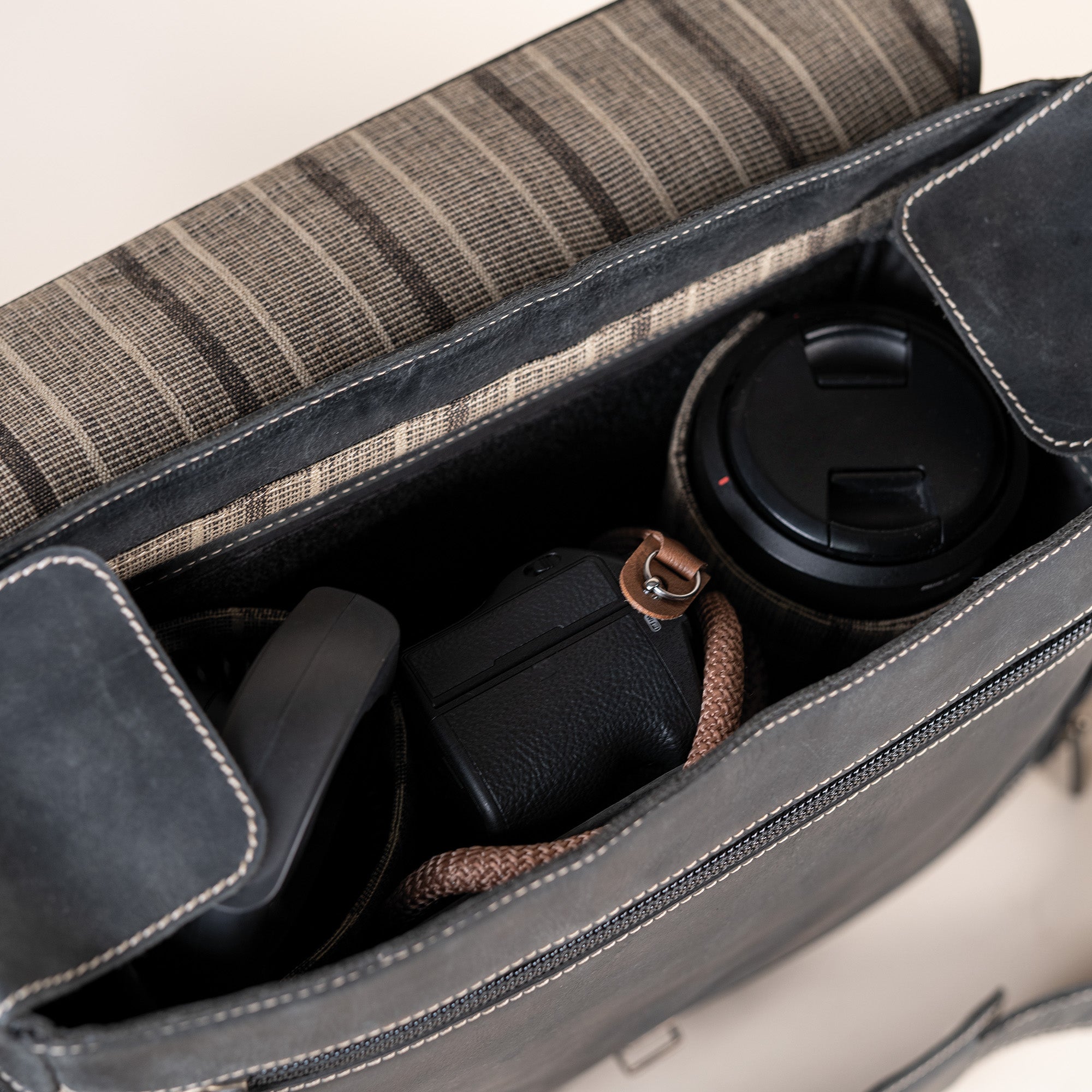 If you do not want to take your photo equipment with you, you can simply remove the bridge and the photo tray. Now you have spacious inner compartment and can use the bag as a regular messenger bag. Your photo equipment is safely stowed in the photo tray and can be kept separately. The lid closes the photo tray completely and protects your camera from dust.