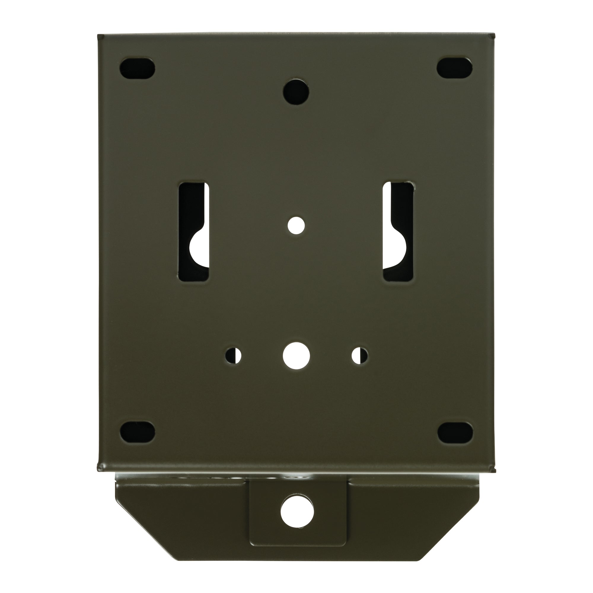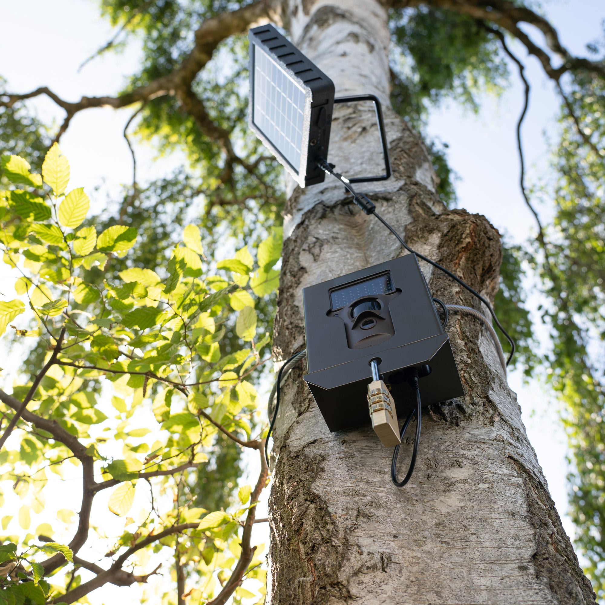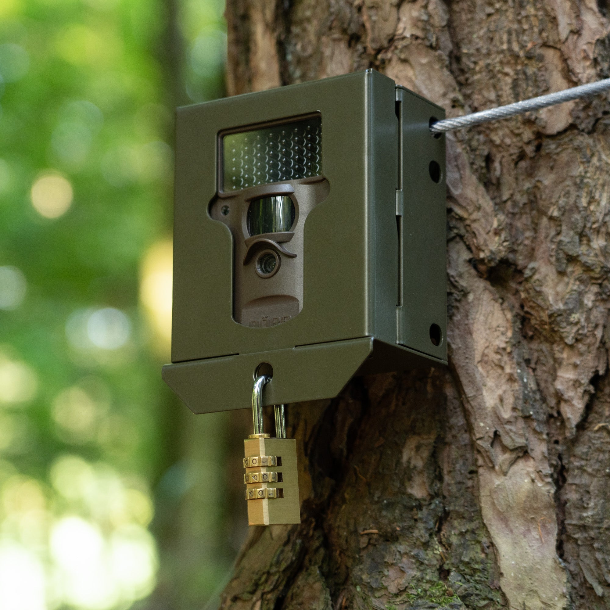 Eine Vielzahl von Öffnungen auf der Rückseite des Gehäuses bieten variable Befestigungsmöglichkeiten. Den besten Schutz vor Diebstahl erreichen Sie, wenn Sie das Gehäuse an einen Baum schrauben oder mit Schrauben und Dübeln an einer Wand befestigen.