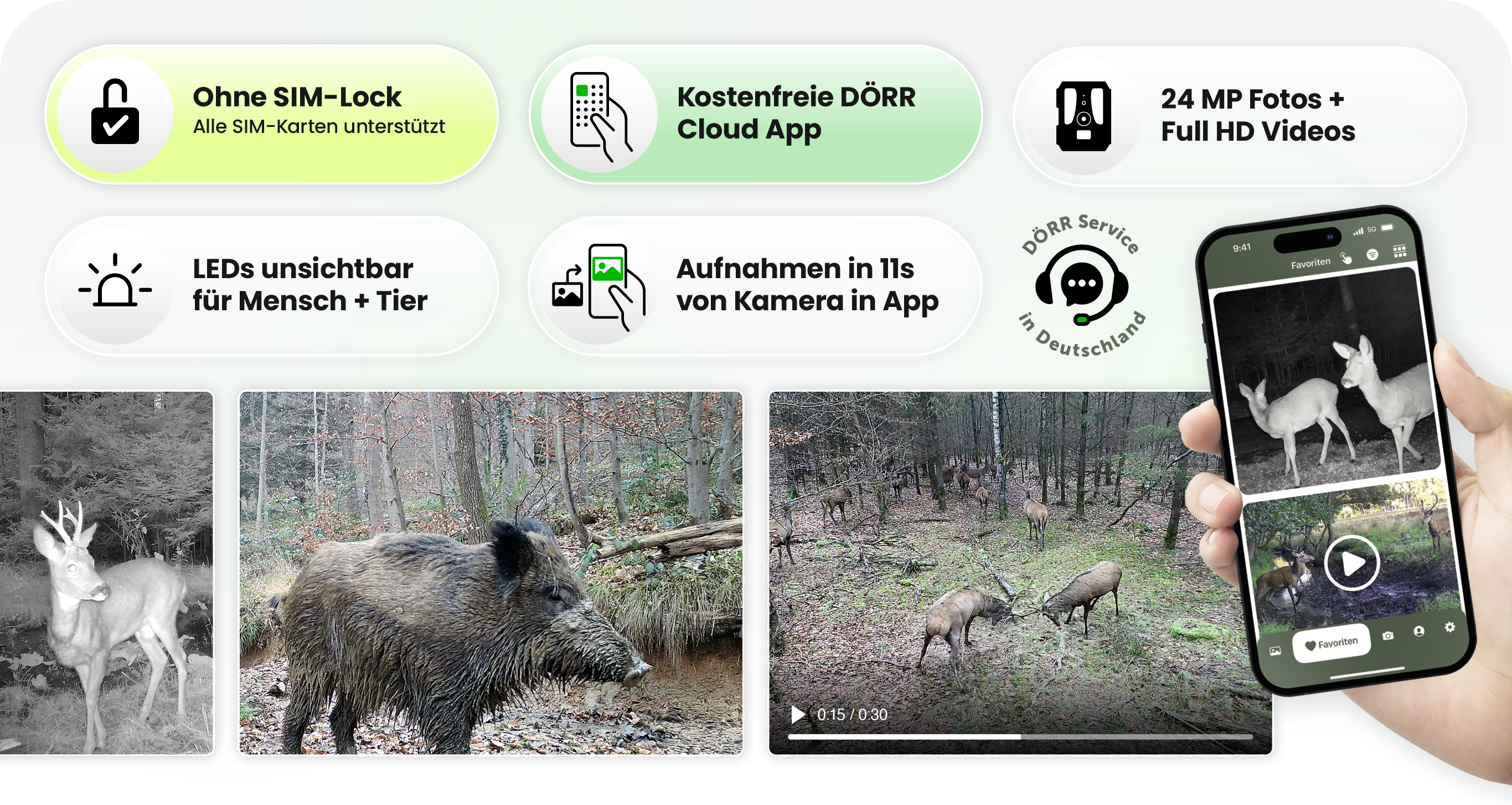 Entdecke die DÖRR SnapShot Cloud Pro 4G - deine smarte Wahl für hochauflösende Wildtierbeobachtung und Sicherheitsüberwachung! Mit unserer intuitiven DÖRR APP für iOS und Android Smartphones und Tablets, sowie der benutzerfreundlichen Webanwendung hast du die volle Kontrolle über deine Fotofalle. Mit beeindruckenden 24 MP Bildern und gestochen scharfen Full HD Videos bleibst du immer auf dem Laufenden. Dank des schnellen Bild- und Videoversands* verpasst du nie wieder etwas Wichtiges, egal, wo du gerade bist. Ob du dein Revier, deine Kirrung, dein Haus, deinen Garten, deine Baustelle oder deinen Wohnwagen im Auge behalten möchtest – unsere Kamera erfüllt alle deine Überwachungsbedürfnisse.