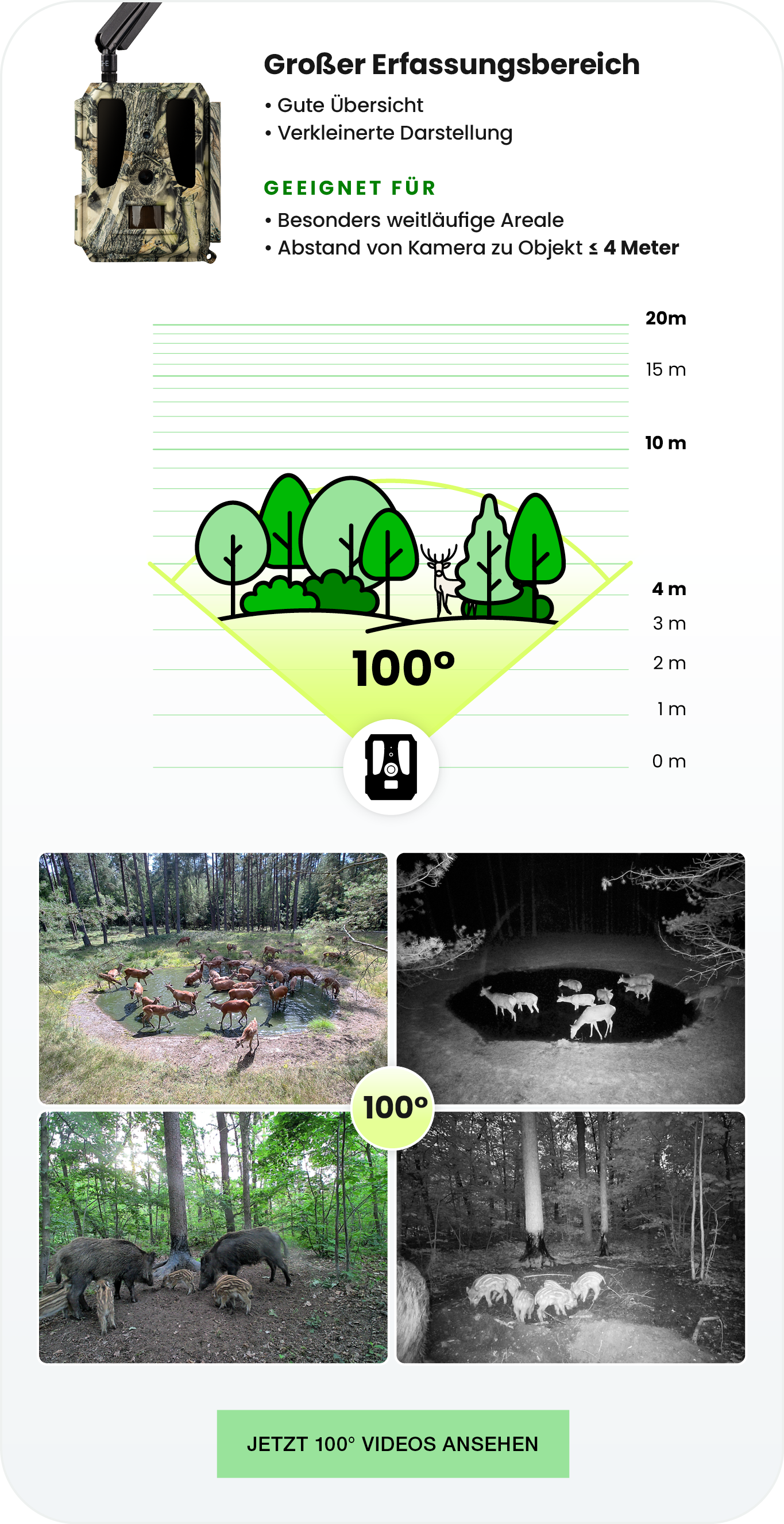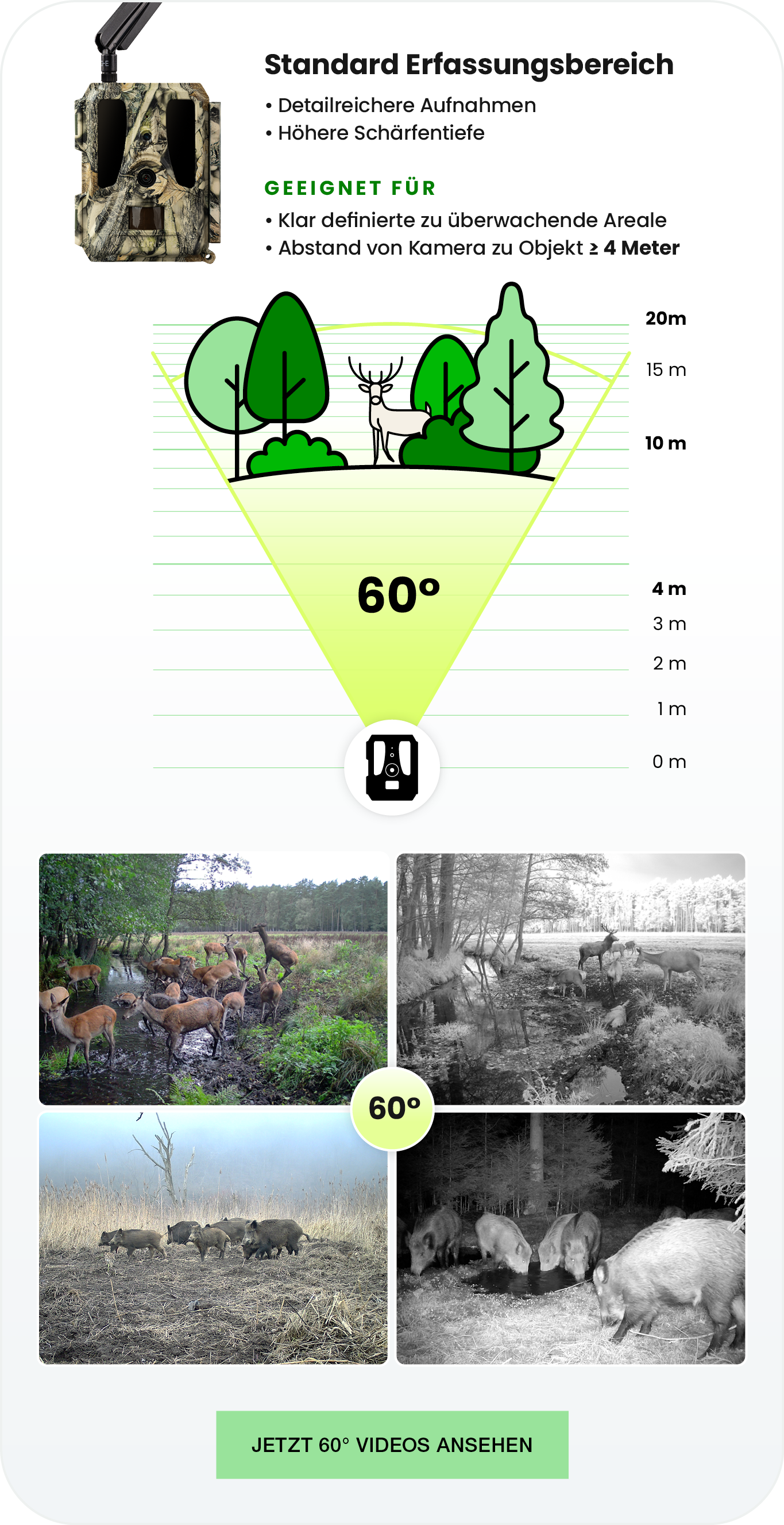 ✓ 60° BILDWINKEL & 20M REICHWEITEMit einem breiten Erfassungsbereich und einer Reichweite von bis zu 20 Metern bietet die Kamera umfassende Überwachung, auch in entlegenen Gebieten. |