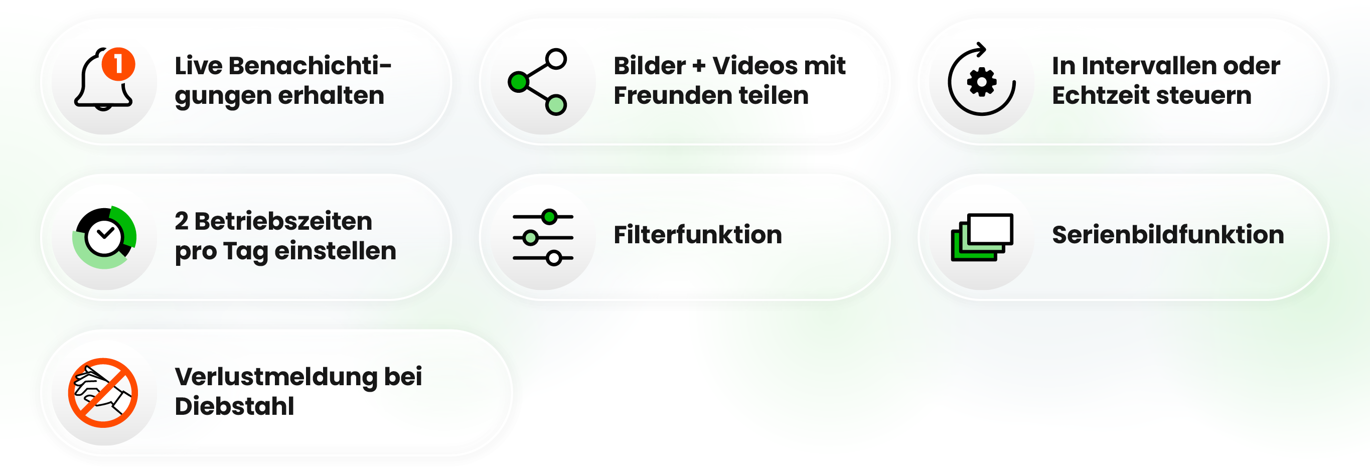 Mit unserer selbst entwickelten DÖRR Cloud App hast du die volle Kontrolle über deine SnapShot Kamera(s). Neben den Einstellungen für Kamera, Blitz und PIR-Bewegungsmelder stehen dir weitere praktische Funktionen zur Verfügung: