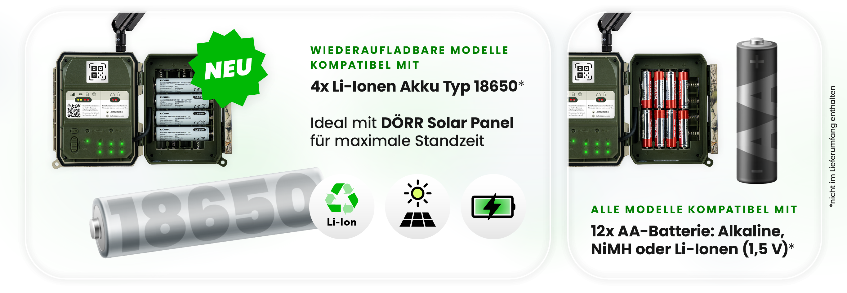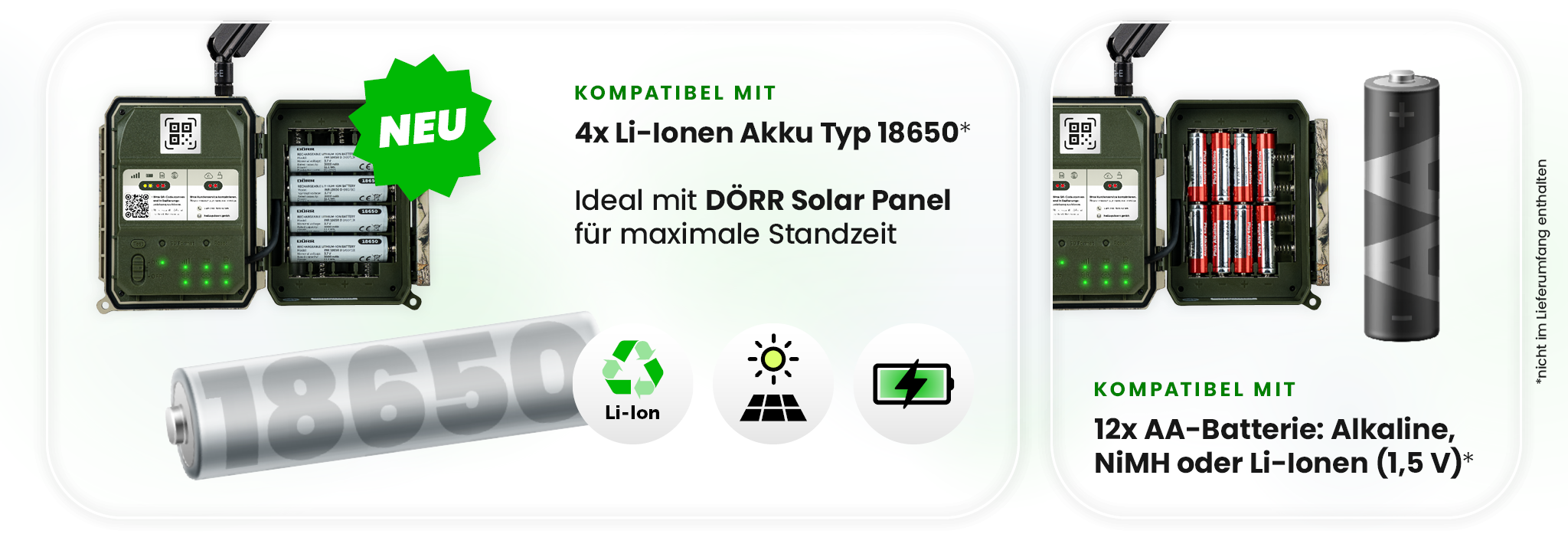 Für den Betrieb werden 12 Mignon AA LR6 1,5V Alkaline Batterien oder 4 Akkus Typ 18650 benötigt (nicht enthalten). Die Standby-Laufzeit beträgt bis zu 8 Monate (*abhängig von Einstellungen, Temperatur & Batterien).