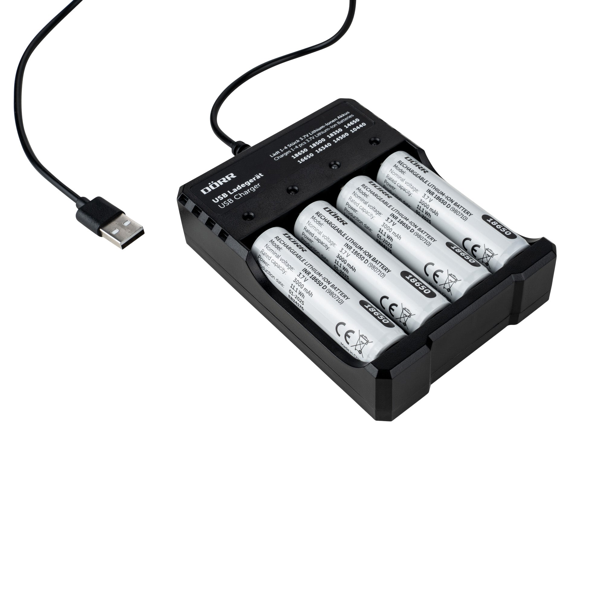 Vielseitiges DÖRR USB-Akkuladegerät zum Laden von 1 bis 4 wiederaufladbaren Lithium-Ionen-Akkus. Kompatibel mit den Typen 18650, 18500, 18350, 14650,16650, 16340, 14500 oder 10440. Für mehr Produktinfos klicke hier.